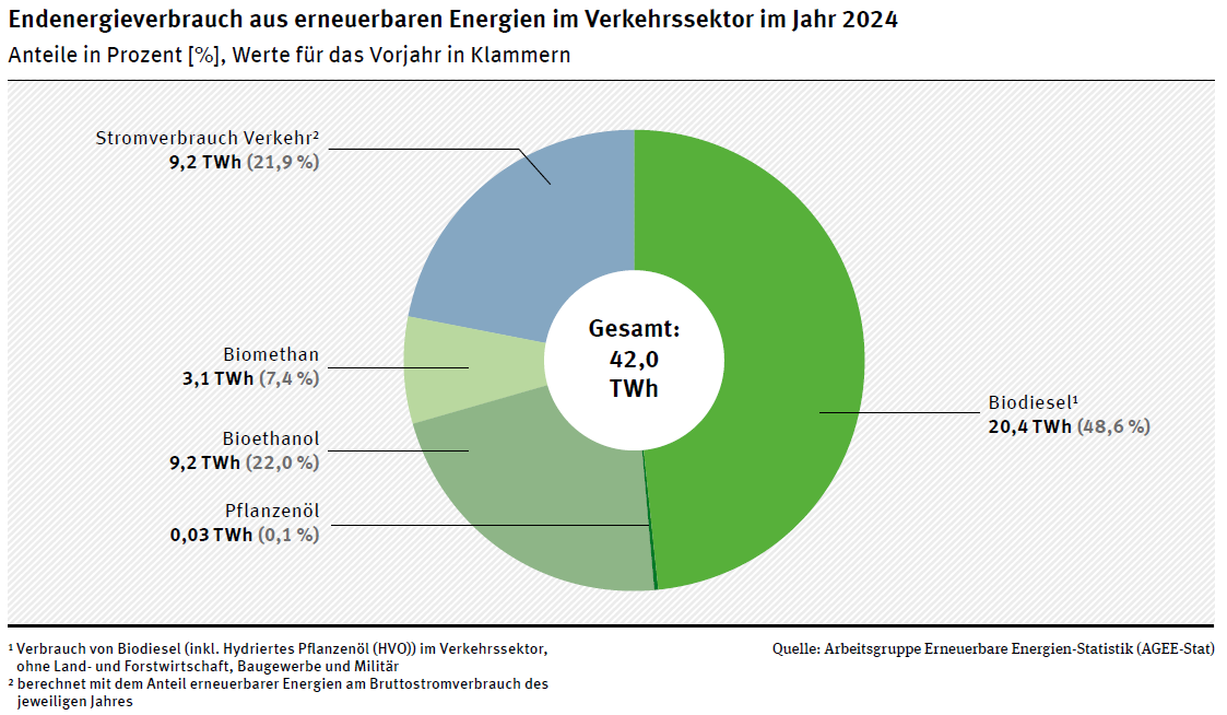Basierend auf einer Hochrechnung bereits vorliegender vorläufiger Monatsdaten des Bundesamtes für Wirtschaft und Ausfuhrkontrolle (BAFA) lag der Gesamtabsatz von Biokraftstoffen im Jahr 2024 deutlich unter dem Niveau des Jahres 2023. Der Absatz von Biodiesel und hydriertem Pflanzenöl (HVO) ist nach derzeitigen Erkenntnissen durch den insgesamt weiterhin rückläufigen Dieselverbrauch und insbesondere auch aufgrund neuer Regelungen der 38. BImSchV besonders stark zurückgegangen. Mit 20,4 TWh wurden fast 21 Prozent weniger Biodiesel und HVO abgesetzt als im Vorjahr. Im Jahr 2025 ist allerdings wieder mit einem Anstieg zu rechnen. Der Absatz von Bioethanol wuchs dagegen um etwa 1,1 Prozent auf etwa 9,2 TWh. Der Einsatz von Biomethan als Kraftstoff lag insbesondere wegen des deutlich erhöhten biogenen Anteils beim LNG gegenüber 2023 mit 3,1 TWh etwa 75 Prozent über dem Vorjahreswert. Pflanzenöl wurde weiterhin in nur sehr geringem Umfang eingesetzt (etwa 3.000 Tonnen dies entspricht 0,03 TWh).