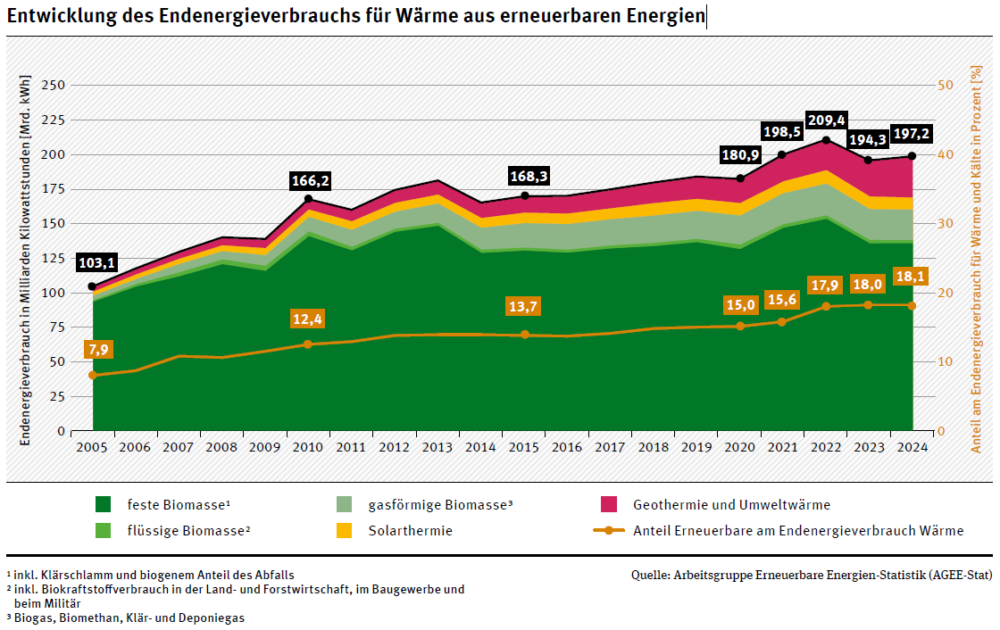 Nach derzeit verfügbaren Daten lag der Anteil der erneuerbaren Energien am Endenergieverbrauch für Wärme und Kälte im Jahr 2024 mit 18,1 Prozent leicht über dem Wert des Vorjahres (2023: 18,0 Prozent).