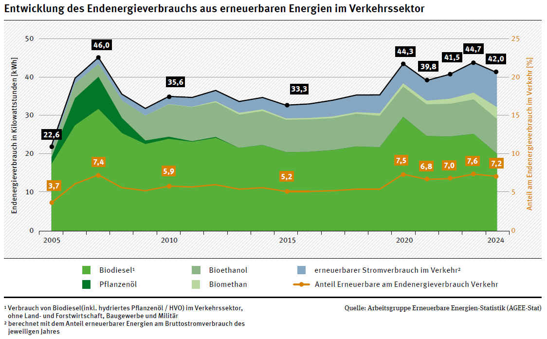 Auch im Jahr 2024 bleibt der Verkehrssektor der Bereich mit dem geringsten Anteil an erneuerbaren Energien. So sank der Anteil erneuerbarer Energien am gesamten Endenergieverbrauch im Verkehr von 7,6 Prozent im Vorjahr auf 7,2 Prozent. Insgesamt verminderte sich der Endenergieverbrauch aus erneuerbaren Energieträgern im Verkehr um ca. 6 Prozent (auf 42,0 TWh), während gleichzeitig auch der gesamte Endenergieverbrauch im Verkehr um etwa 1 Prozent auf 581 TWh zurückging.