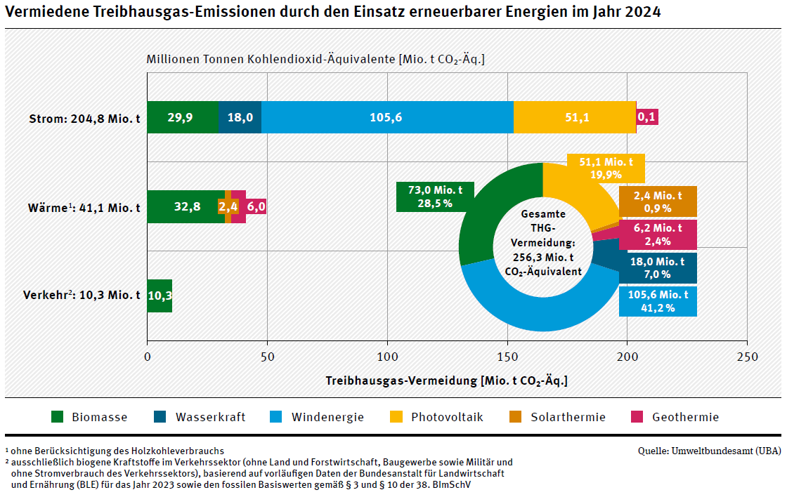 Insgesamt wurden im Jahr 2024 durch den Einsatz erneuerbarer Energien rund 256 Mio. t CO₂-Äquivalente vermieden. Dies ist eine moderate Steigerung im Vergleich zum Vorjahr (250 Mio. t vermiedene Emissionen), die maßgeblich durch die gestiegene erneuerbaren Stromerzeugung erreicht wurde. Den größten Anteil an der Emissionsvermeidung hatte mit 106 Mio. t CO₂-Äquivalenten die Stromerzeugung aus Windkraft. Insgesamt entfielen auf den stark dominierenden Stromsektor rund 205 Mio. t CO₂-Äquivalente. Im Wärmesektor wurden 41 Mio. t CO₂-Äquivalente und durch Biokraftstoffe im Verkehr etwa 10 Mio. t CO₂-Äquivalente vermieden.