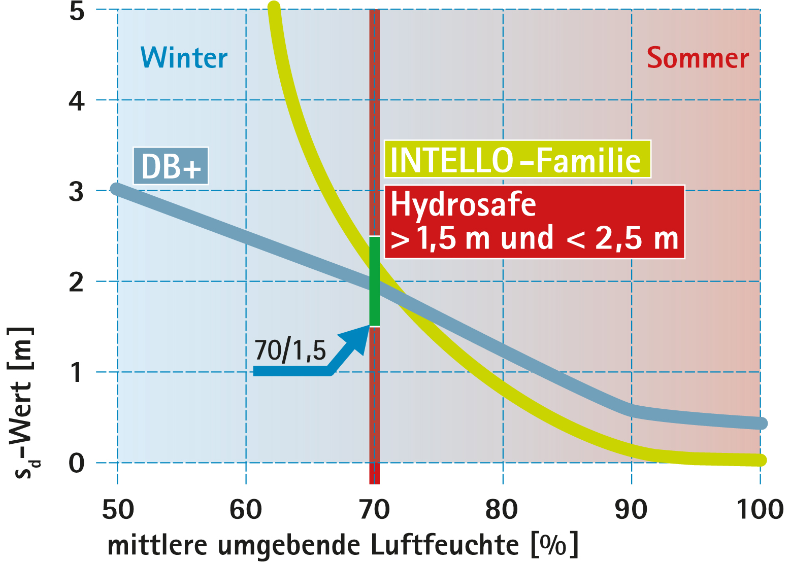 Die Bahnen aus der INTELLO Linie erreichen bei 70 % mittlerer Feuchte (90 % Raumluftfeuchtigkeit und 50 % in der Dämmebene) einen sd-Wert von über 2 m (DB+ 2 m) und bieten den Bauteilen auch während baubedingt erhöhten rel. Luftfeuchtigkeiten einen ausreichenden Schutz.