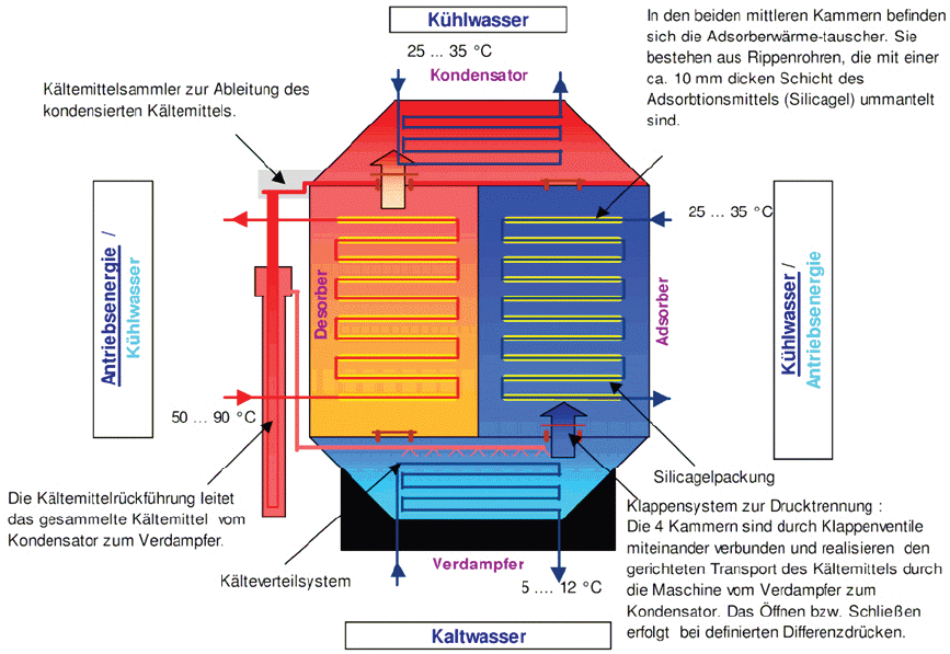 Funktionsschema einer Adsorptionskältemaschine [1]
