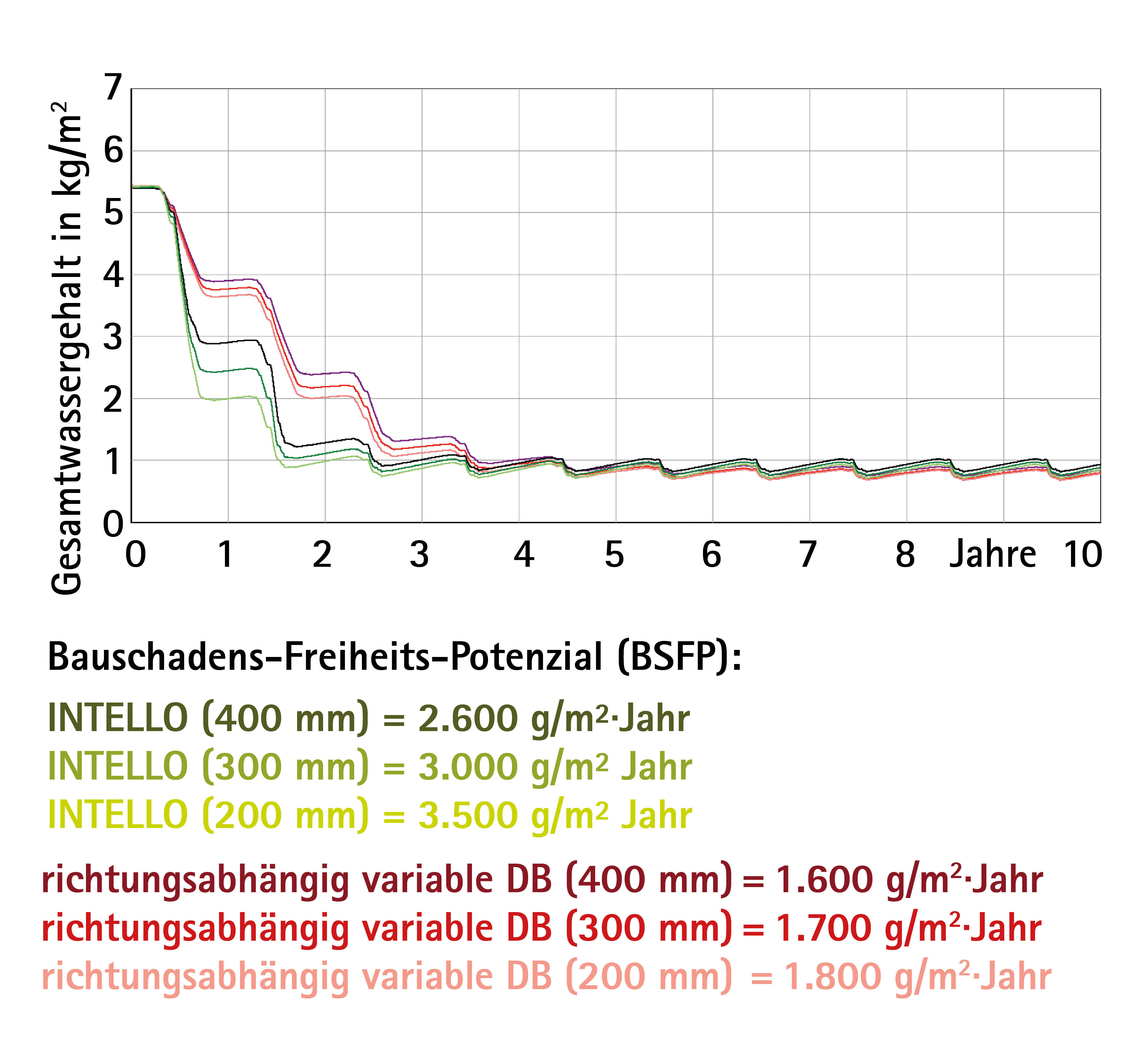 Die aus der Konstruktion innerhalb eines Jahres austrocknende Feuchtigkeitsmenge in g/m² beschreibt das Bauschadens-Freiheits-Potenzial und definiert damit die Höhe des Schutzes bei unvorhergesehen eingedrungener Feuchtigkeit (z. B. durch Konvektion, Flankendiffusion usw.). Die Berechnungsergebnisse zeigen, dass die PE-Folie (sd-Wert 100 m) keine signifikante Austrocknung der Feuchtigkeit aus der 200 mm starken Dämmschicht ermöglicht. In der Wärmedämmebene ausgefallenes Kondensat kann nicht mehr entweichen. Auch mit einer Dampfbremse mit einem konstanten sd-Wert von 5 m bestehen im Vergleich nur sehr geringe Trocknungsreserven.