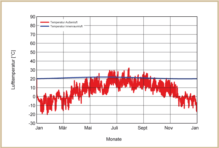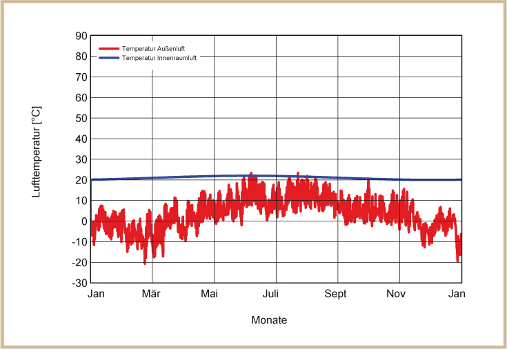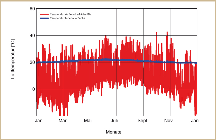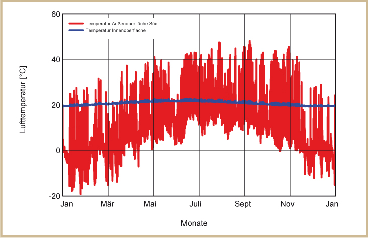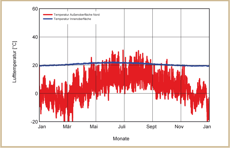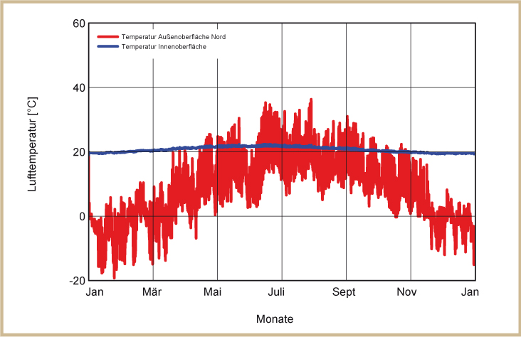 Holzkirchen liegt südlich von München auf einer Seehöhe von 680 m mit einem kalten, rauen Klima. Für die Klimarandbedingungen wurde aus das Feuchtereferenzjahr des Fraunhofer Instituts für Bauphysik ausgewählt, welches ein besonders feuchtes und kaltes Jahr abbildet. Die links dargestellten Diagramme zeigen die Temperaturverläufe über ein Jahr. Die blaue Linie zeigt die Innen-, die rote die Außentemperaturen (siehe Abb. 12 bis 15).