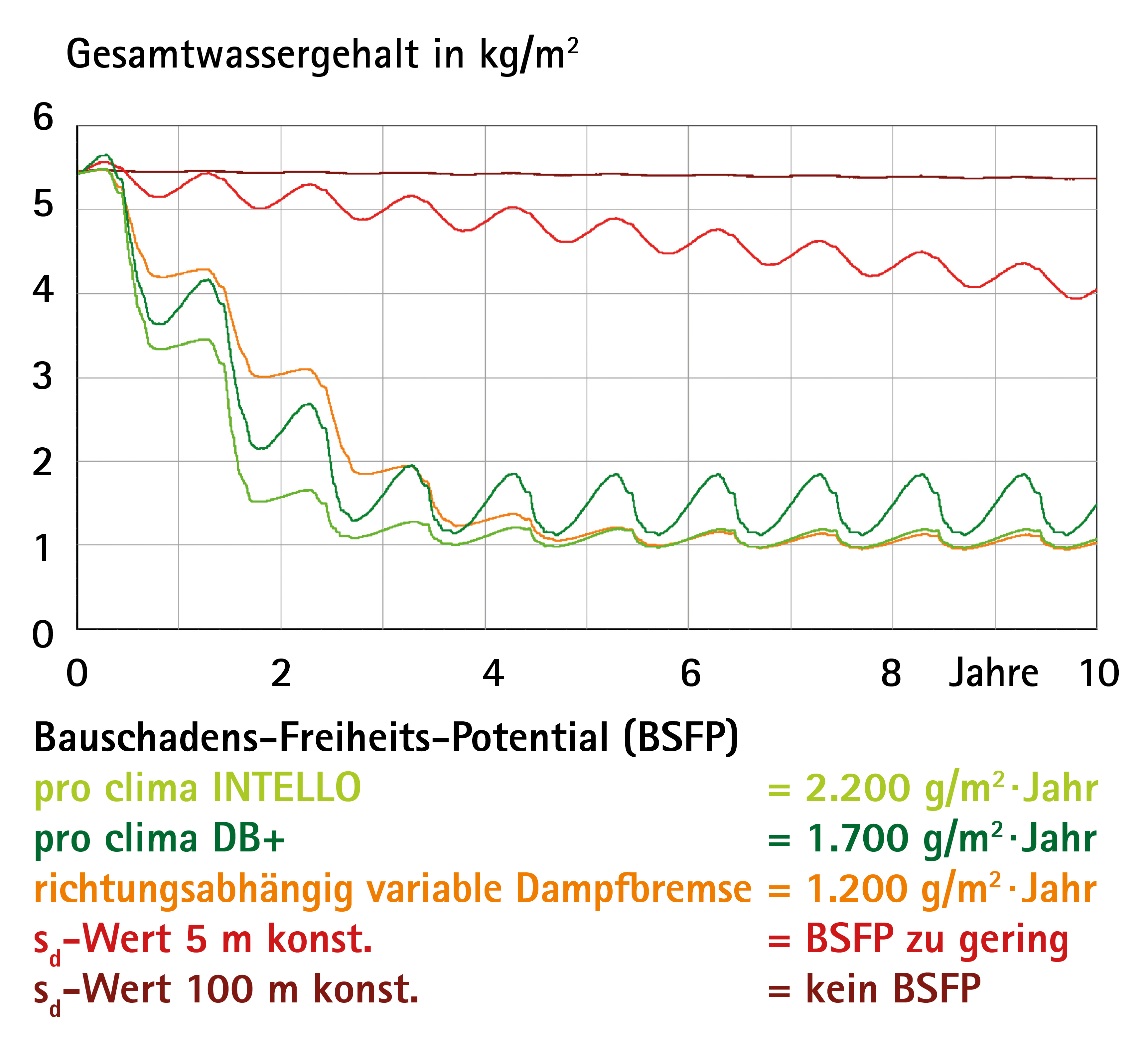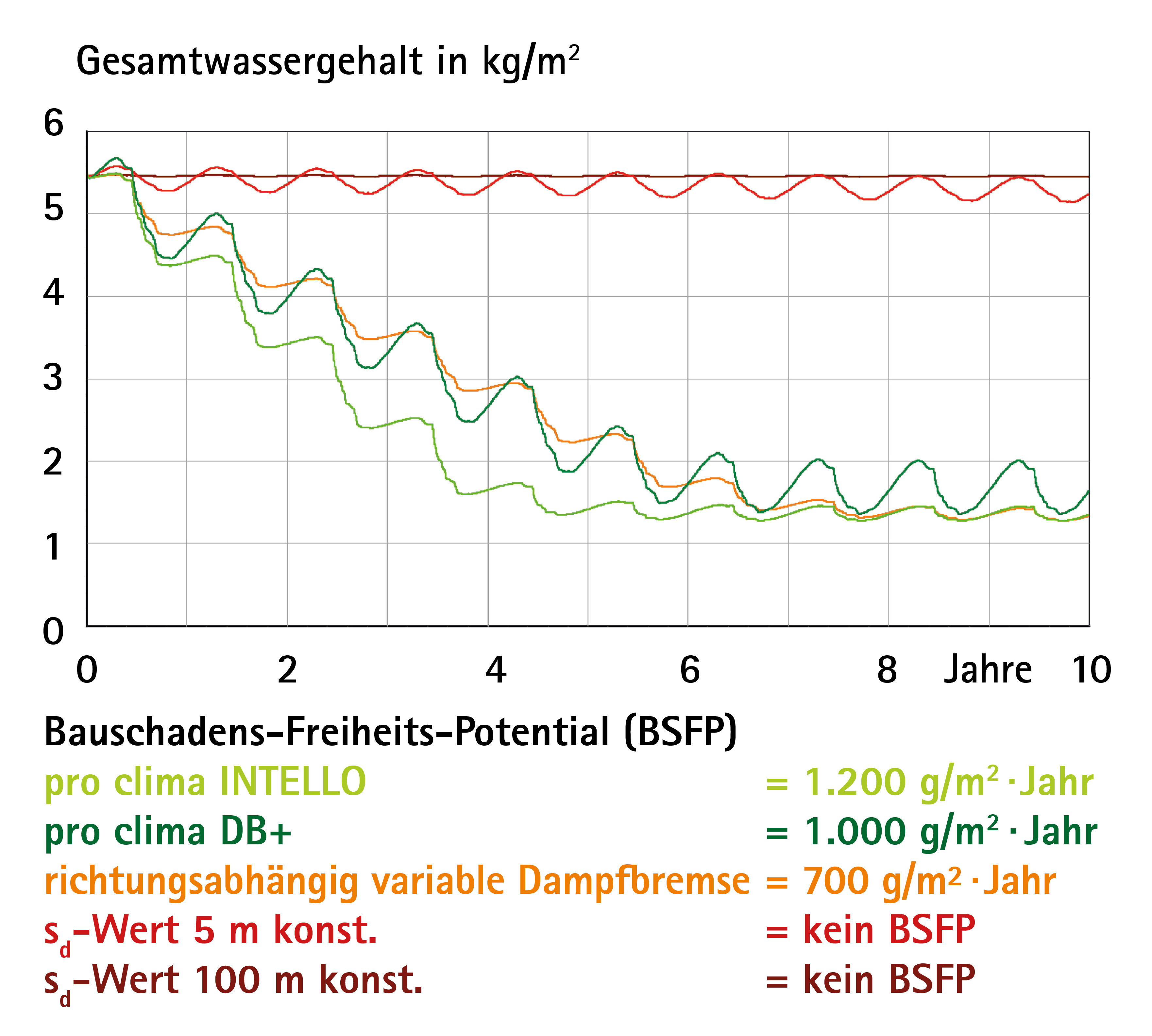 Das Bauschadens-Freiheits-Potenzial (BSFP) ist eine theoretische Größe und erlaubt es die Leistungsfähigkeit von Konstruktionen hinsichtlich des Austrocknungsvermögens miteinander zu vergleichen. Es gibt an, wie viel Feuchtigkeit theoretisch durch unvermeidbare Restleckagen, Flankendiffusion oder feuchte Baustoffe eindringen könnte. Vergleichsgröße ist die Menge an Feuchtigkeit, die innerhalb eines Jahres aus dem Bauteil heraustrocknen kann. Dadurch können verschiedene Konzepte vergleichend gegenüber gestellt werden. Je größer das Bauschadens-Freiheits-Potenzial, desto größer die Sicherheit vor einem Bauschaden.