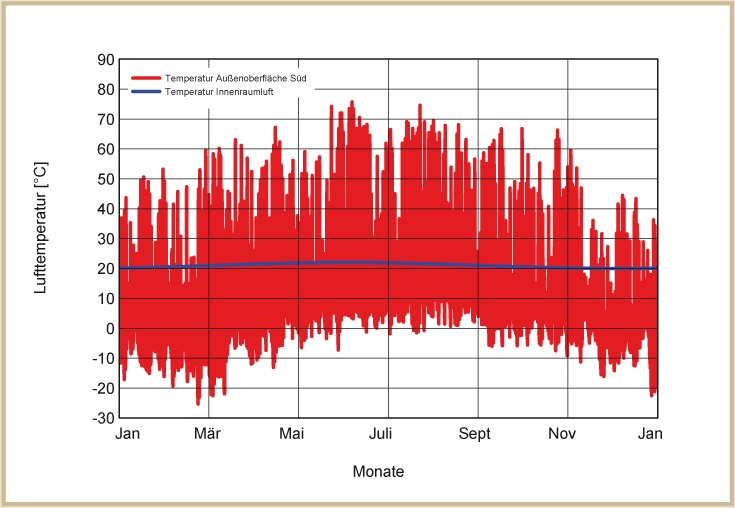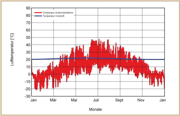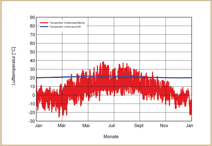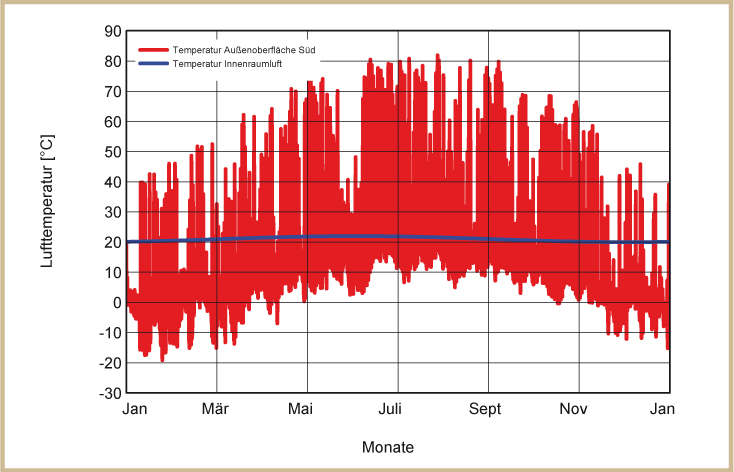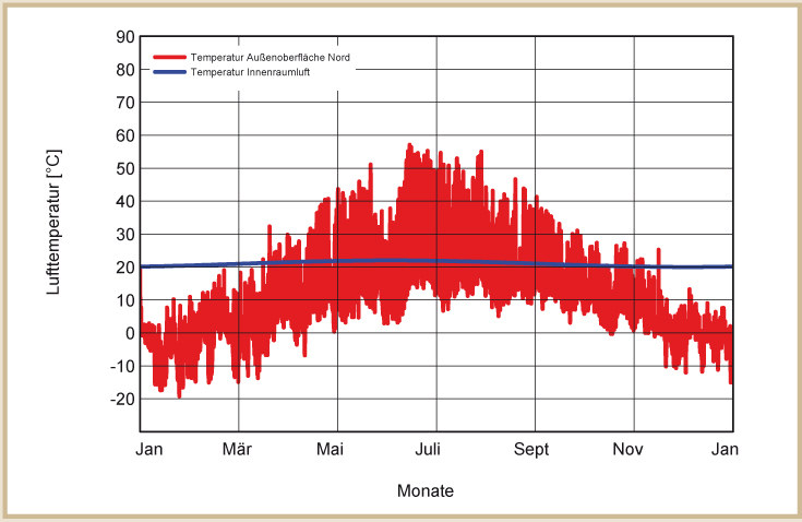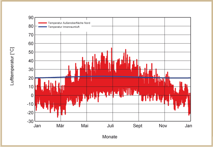 Die Temperaturen in der Außenwand hängen im Wesentlichen von der Farbe der Fassade ab. Auf hellen Fassaden werden durch die Sonneneinstrahlung niedrigere Temperaturen erreicht als auf dunkleren Fassaden. Die dargestellten Temperaturprofile auf der Außenwand entstehen bei normal hellen Putzfassaden (siehe Abb. 31 bis 34).