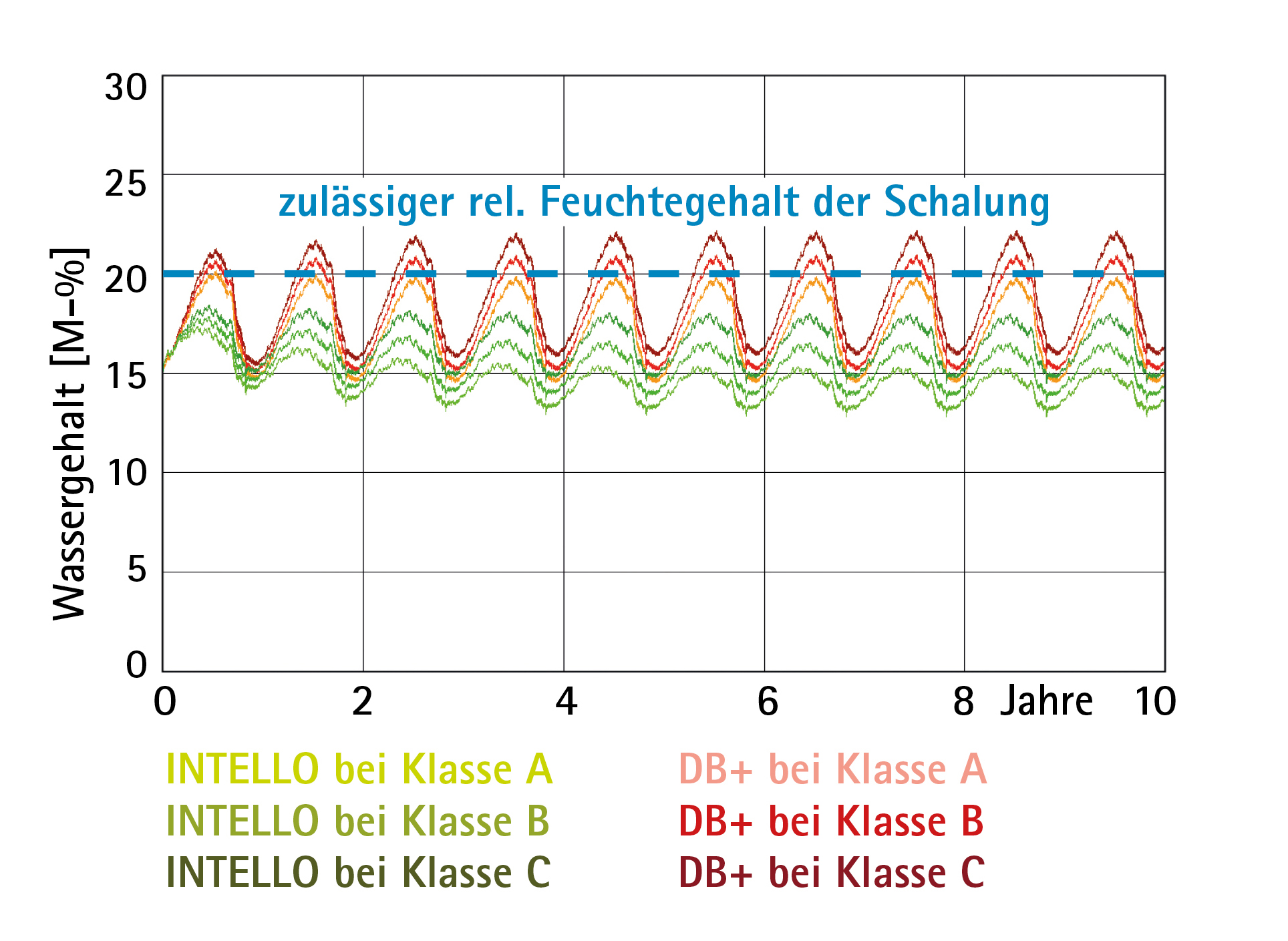 Die maßgebend kritische Schicht in diesen Bauteilen ist die Fichtenschalung unterhalb der Abdichtung. Abb. 26 zeigt die Feuchtegehalte in der 24 mm starken Schalung über einen Zeitraum von 10 Jahren. Auf der sicheren Seite liegend ist es entscheidend, dass in der Fichtenschalung die Feuchtegehalte unterhalb von 20 % liegen (bei Holzwerkstoffplatten liegt die Grenze bei 18 %). Dann ist das Bauteil im Gebrauchszustand funktionsfähig.