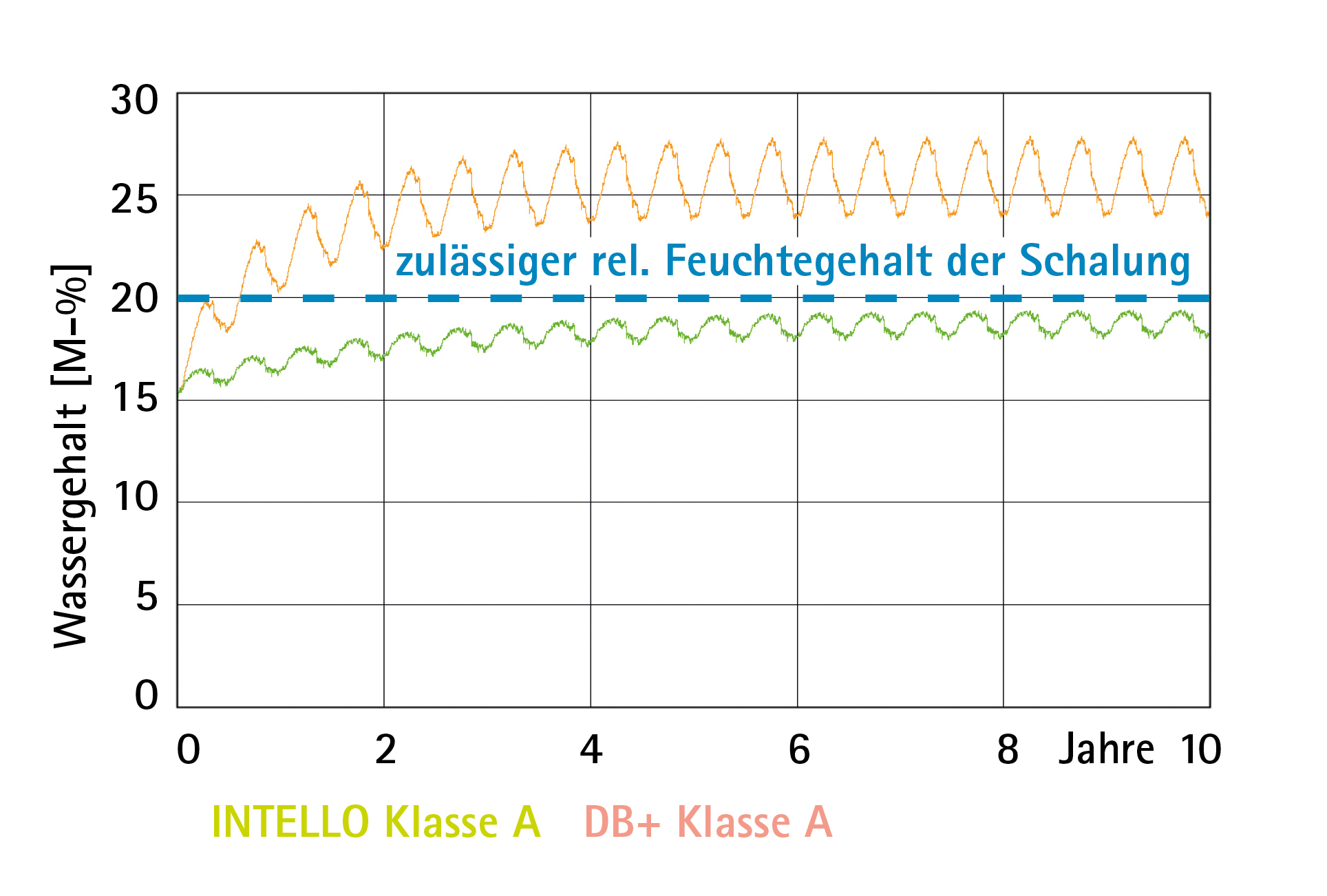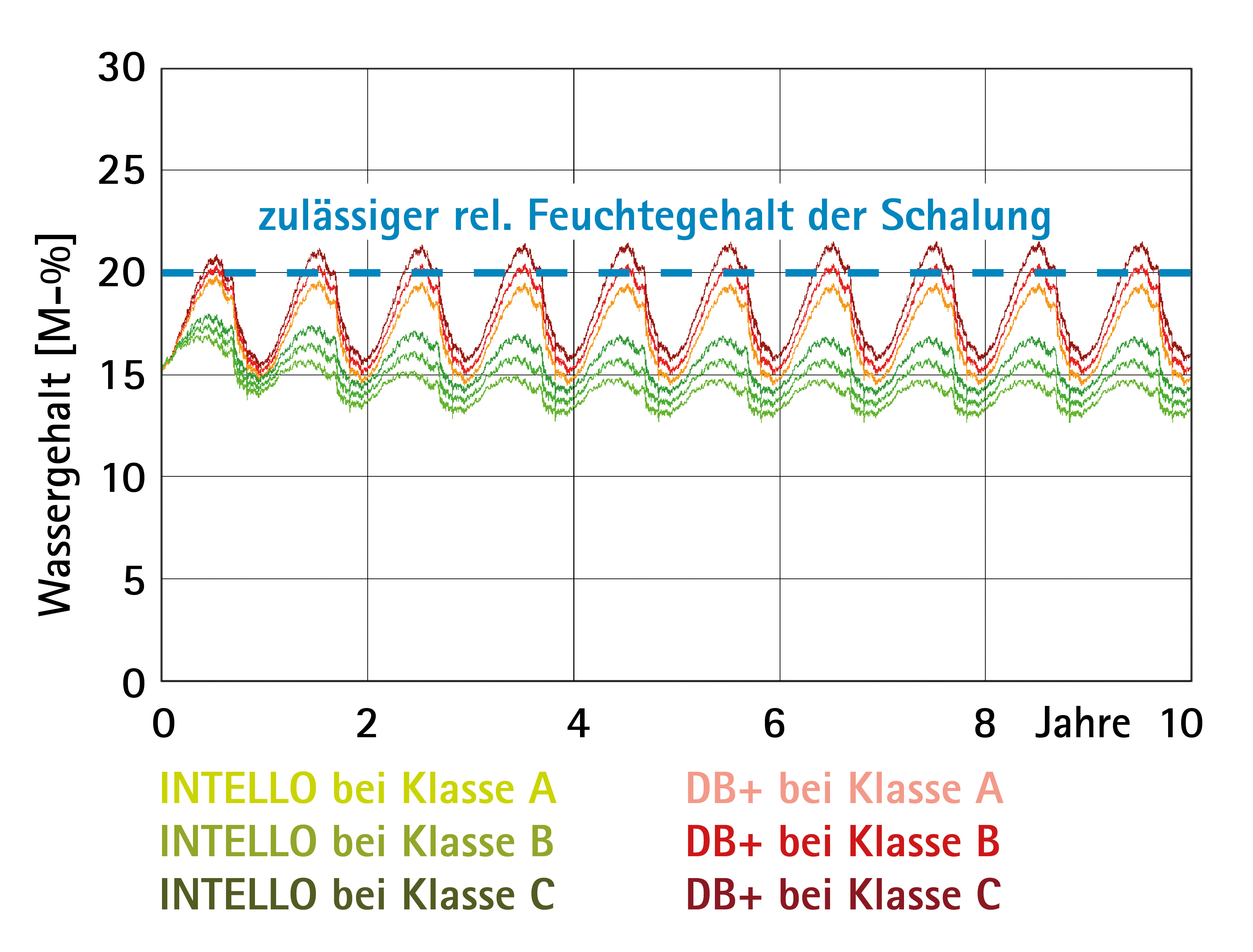 Die Hochleistungs-Dampfbremse INTELLO bietet auch bei Wandkonstruktionen ein erhebliches Bauschadens-Freiheits-Potenzial. Berechnungen mit Delphin mit dem Klima von Holzkirchen zeigen für eine nordorientierte Außenwand mit diffusionsdichter Außenbekleidung bei Verwendung von Bahnen mit dem INTELLO Funktionsfilm immer noch ein ausreichendes Sicherheitspotenzial.