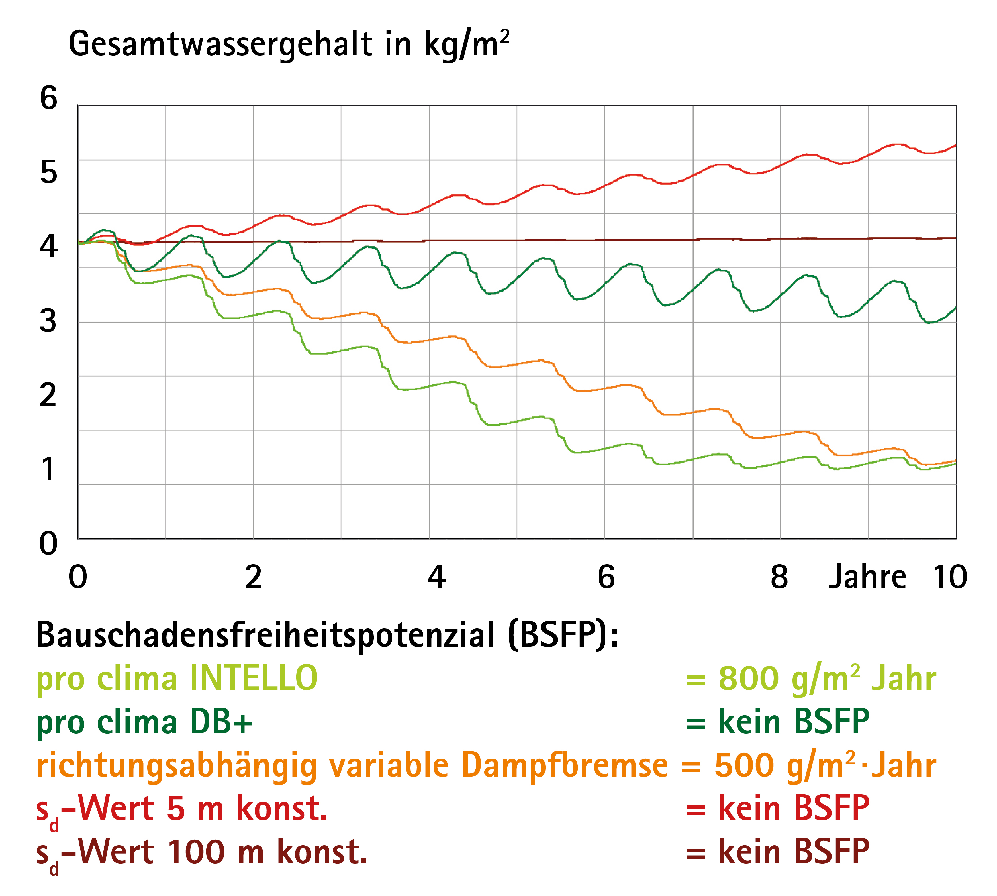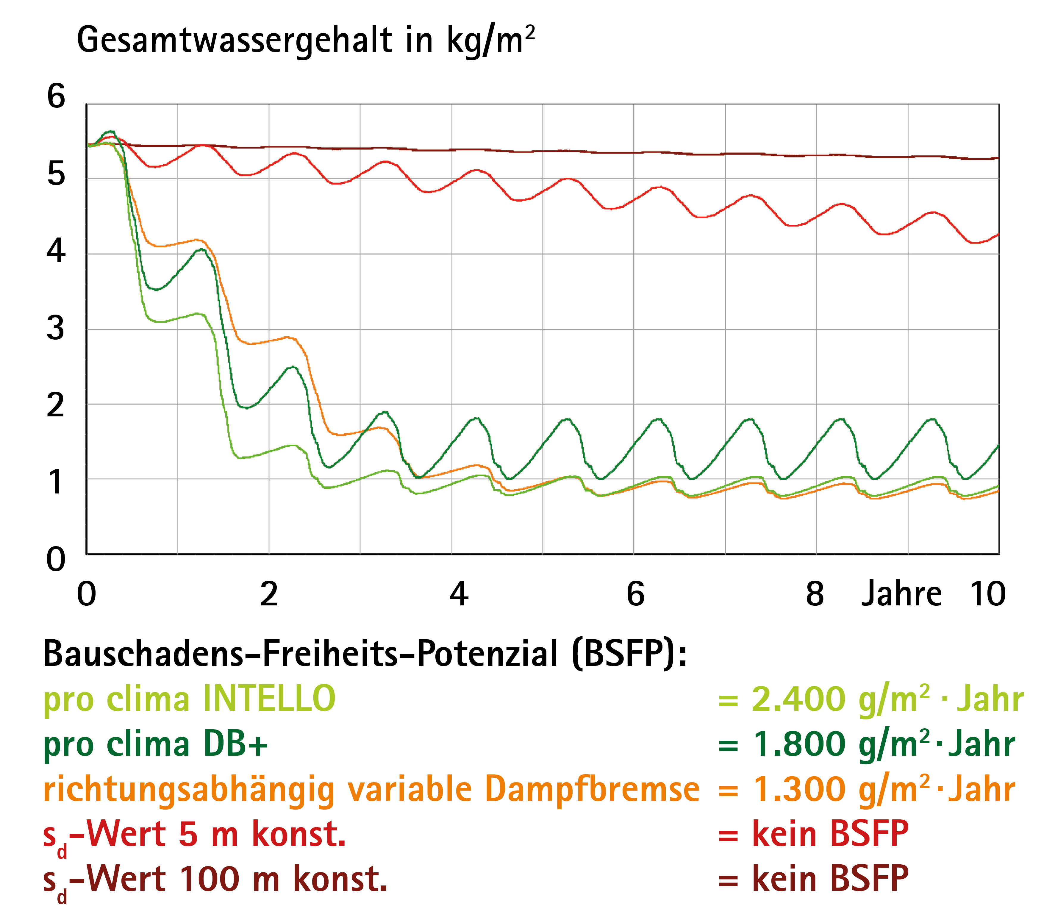 Für die richtungsabhängig variable Dampfbremse ergibt sich eine Trocknungsreserve von 1.700 g/m²·Jahr. Diese ist geringer als die der Konstruktion mit der pro clima DB+. Diese verfügt über eine wesentlich höhere Austrocknung und weist erhebliche Sicherheitsreserven von 2.900 g/m²·Jahr auf.