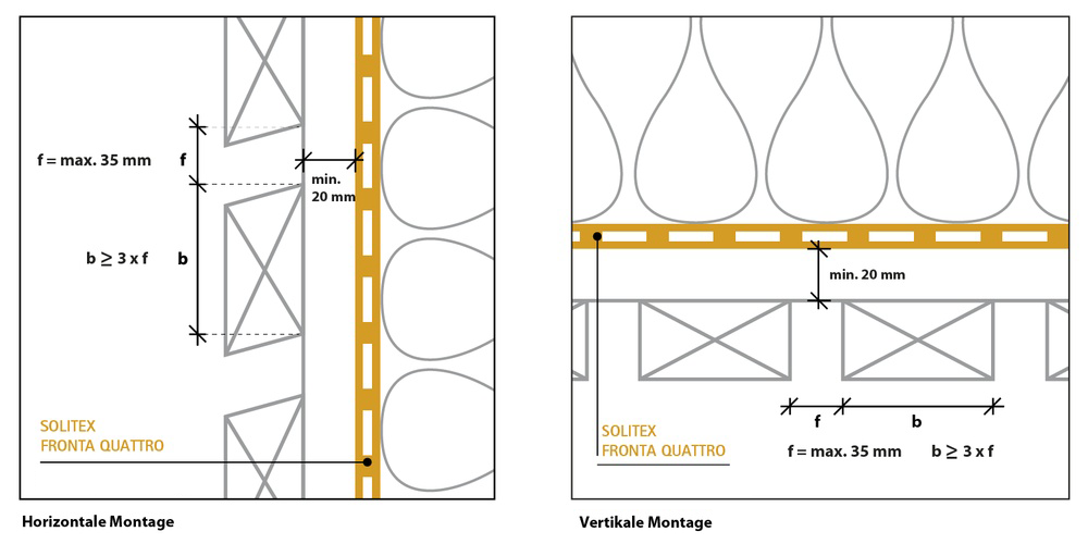 Der aktive Diffusionstransport durch die monolithische Polymer-Membran sorgt für dauerhaft trockene Bauteile. Die schwarze Bahn kann hinter Lückenschalungen mit max. 35 mm Lücke und mind. 20 mm Hinterlüftung eingesetzt werden. Die Außenbekleidung muss dabei mind. dreimal so breit wie die Lücke sein.