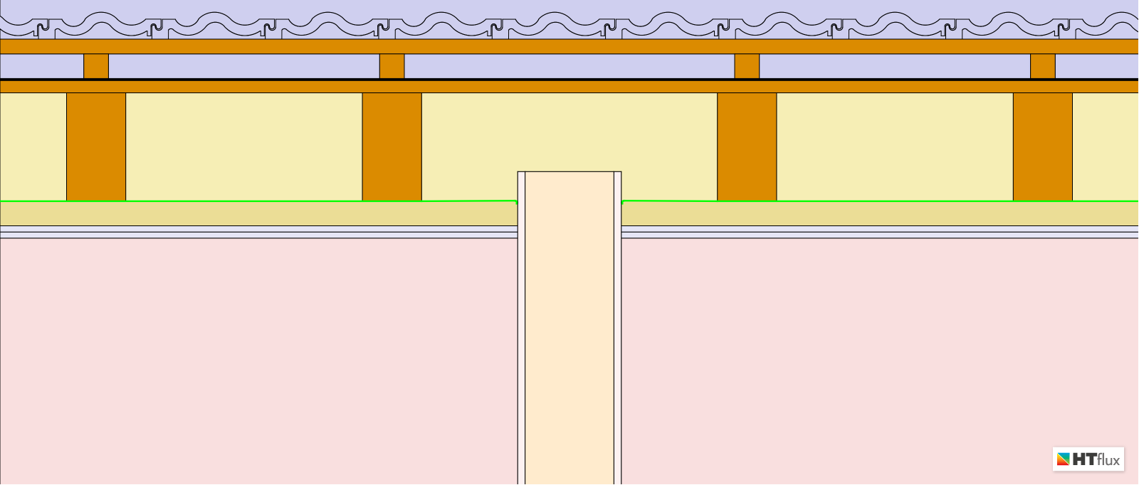 • HTflux zeigt, dass bei entsprechend niedrigen Außentemperaturen eine Kondensatbildung innerhalb der Dampfbremse auftritt. Diese entsteht als Folge der Wärmebrückenbildung durch die Sparren in Kombination mit der zusätzlichen Dämmebene unterhalb der Dampfbremse.