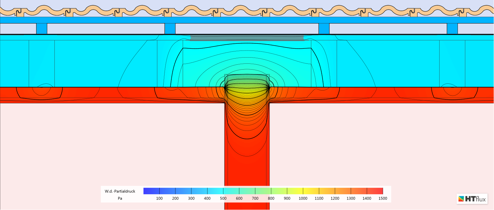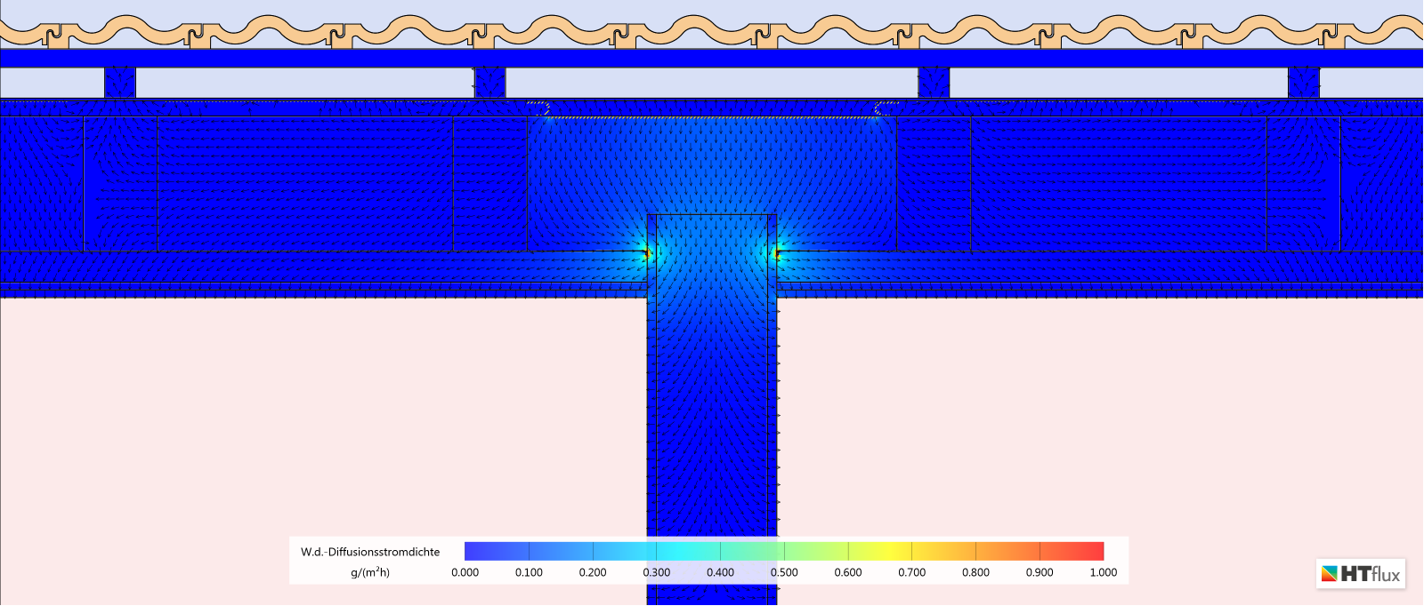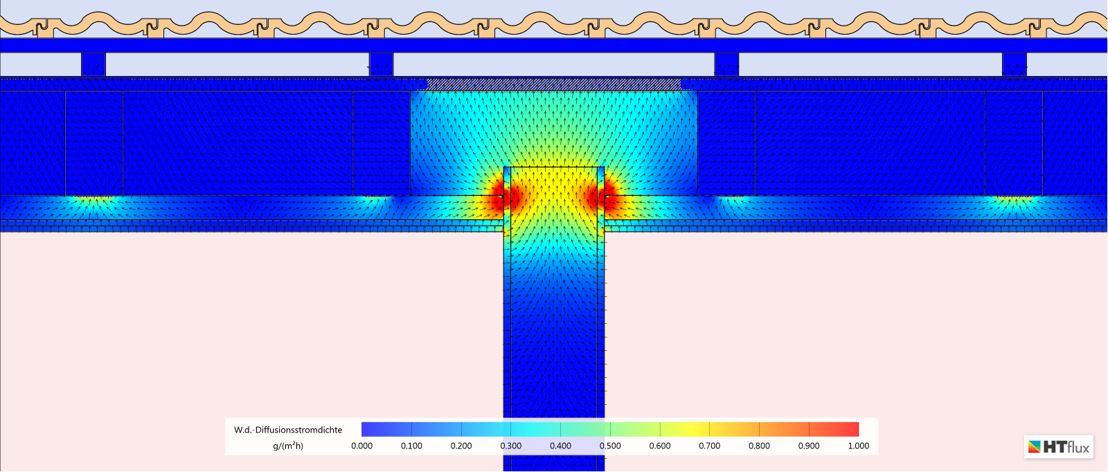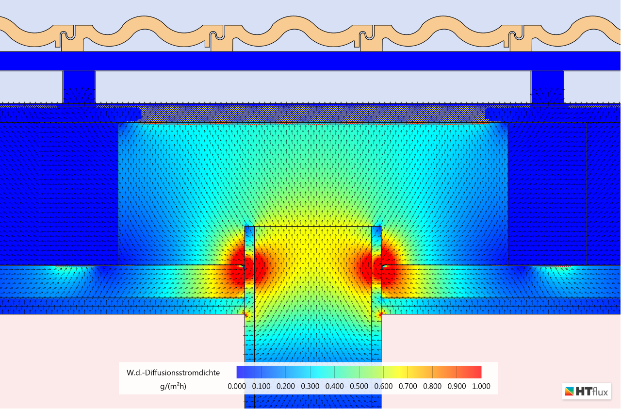 Im vorliegenden Beispiel wird der Effekt der Flankendiffusion in Verbindung mit einem diffusionstechnisch kritischen Dachaufbau untersucht.