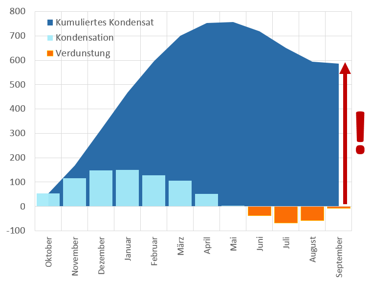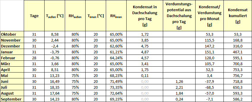 Dadurch ergibt sich in Kombination mit der erhöhten Innenluftfeuchte in diesem Zeitraum eine geringe Differenz des Wasserdampfpartialdrucks zwischen Dachhaut und Innenraum und damit ein sehr geringes Trocknungspotenzial. Durch die ungünstige Anordnung tritt nur in vier Monaten des Jahres Verdunstung auf. Eine vollständige Rücktrocknung ist in diesen daher nicht möglich. Es ist mit Feuchteanreicherung und Folgeschäden zu rechnen.