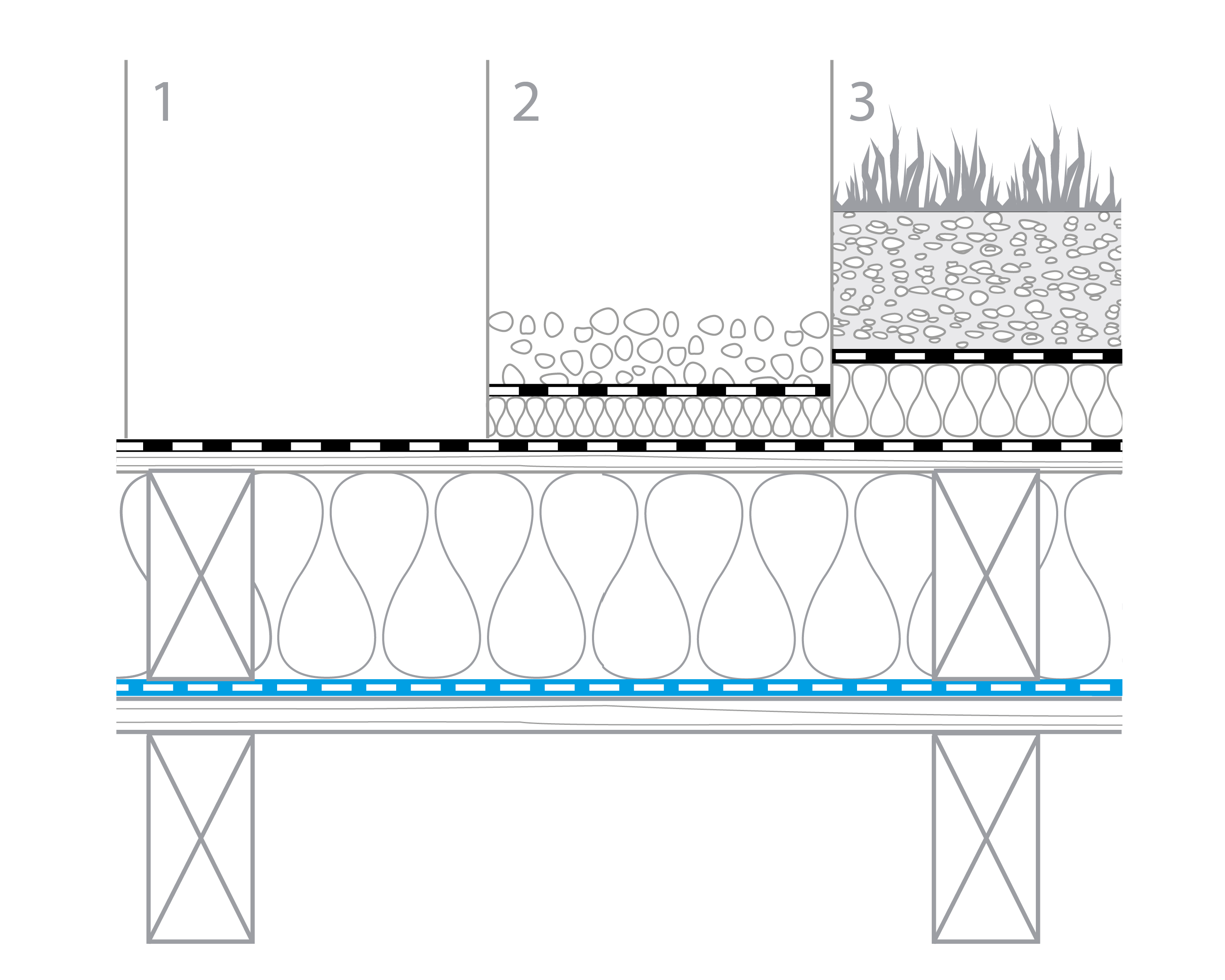 (1) Bahnendach (2) Kiesdach (3) Gründach