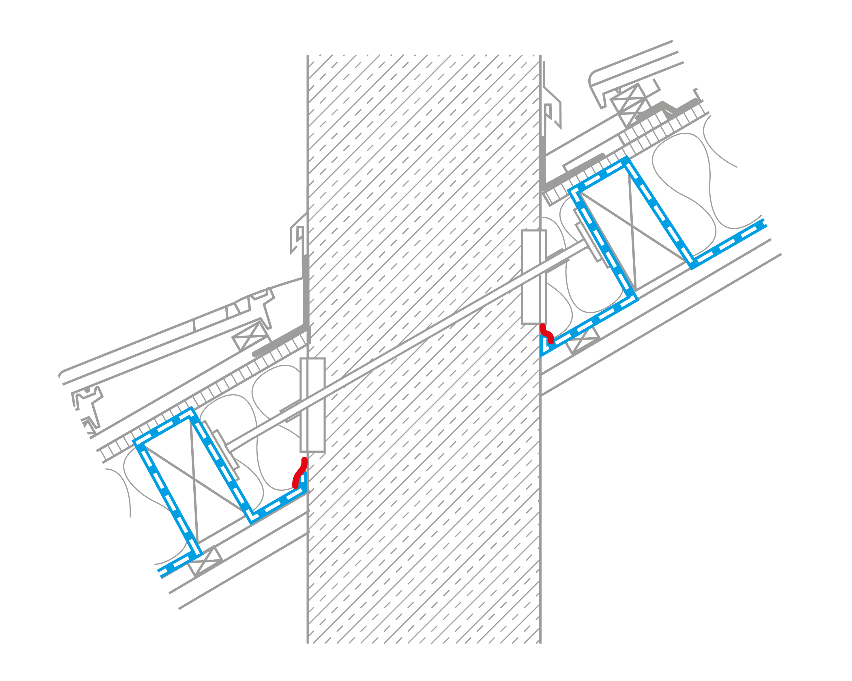 Wird die Luftdichtungsbahn freibewittert, sind provisorisch Folienrinnen / Abweiser über den Durchdringungen vorzusehen. Siehe: Unterdeck-Unterspannbahn / Durchdringungen