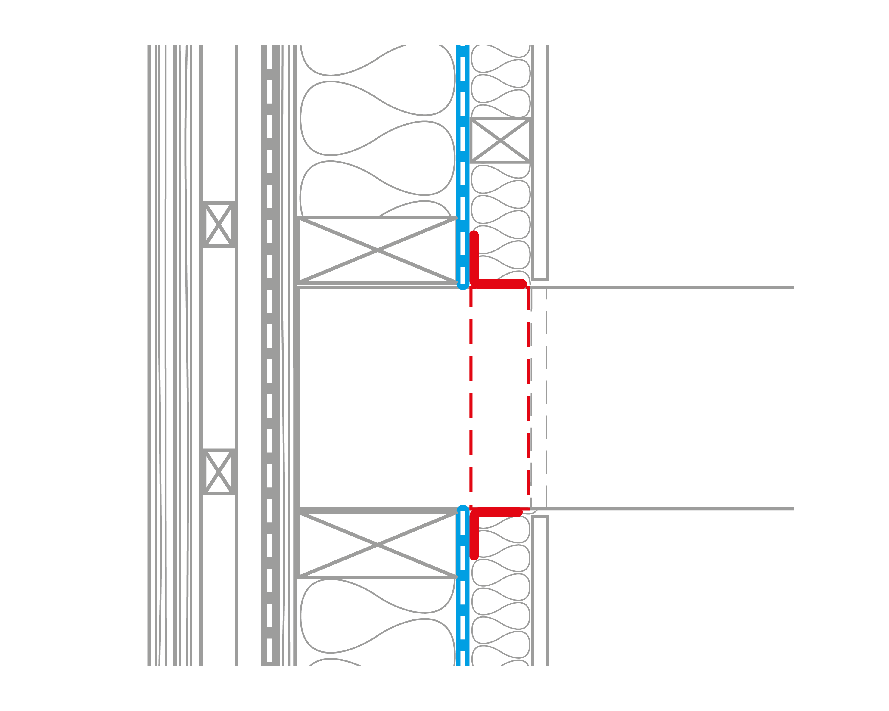 Im Bereich von Innenwänden sollte die Luftdichtungsebene nicht unterbrochen werden. Werden Innenwände vor dem Dämmen und Dichten gestellt, empfiehlt es sich einen robusten (wetterfesten) Dampfbremsbahnenstreifen der pro clima INTELLO X oder DA einzulegen.