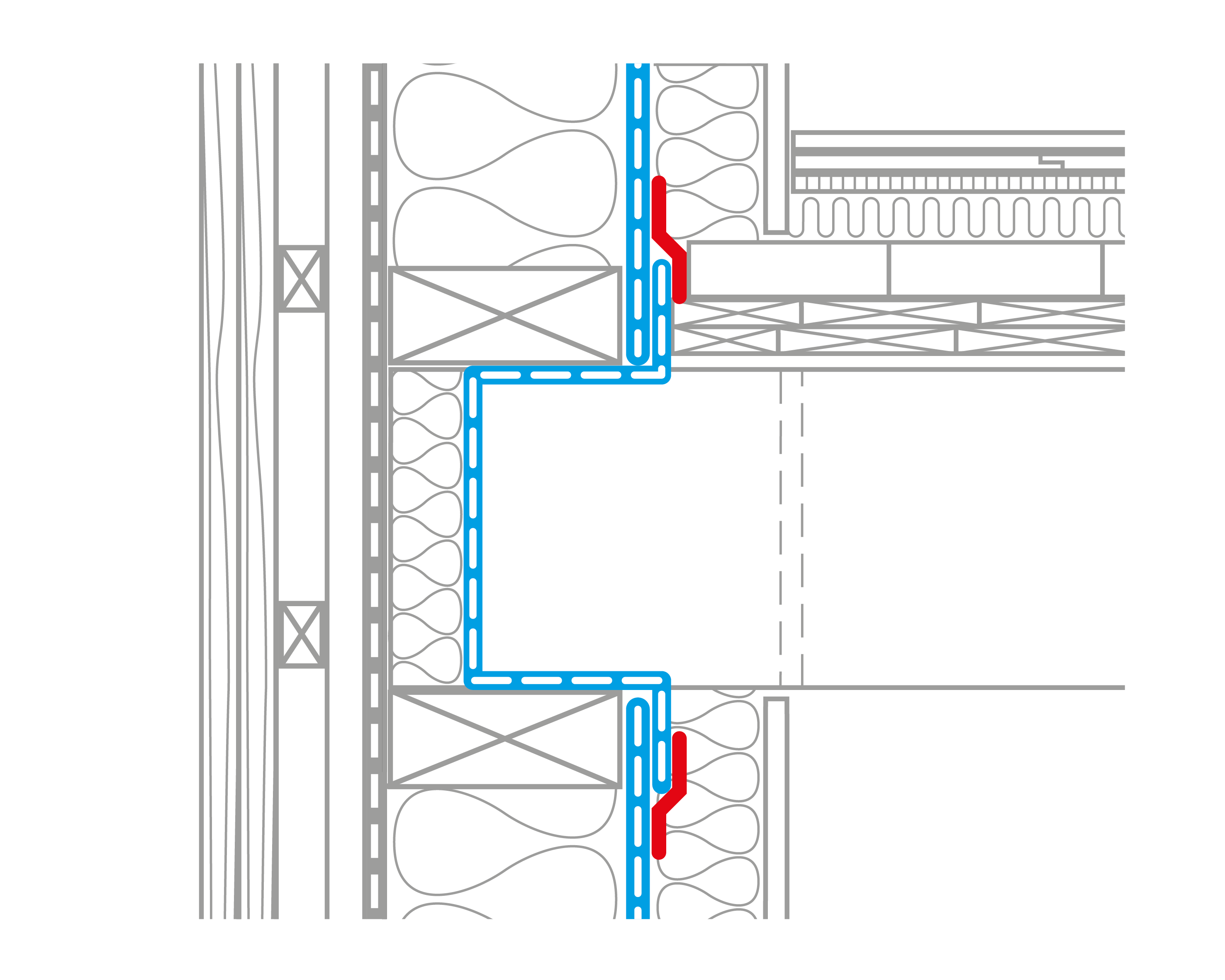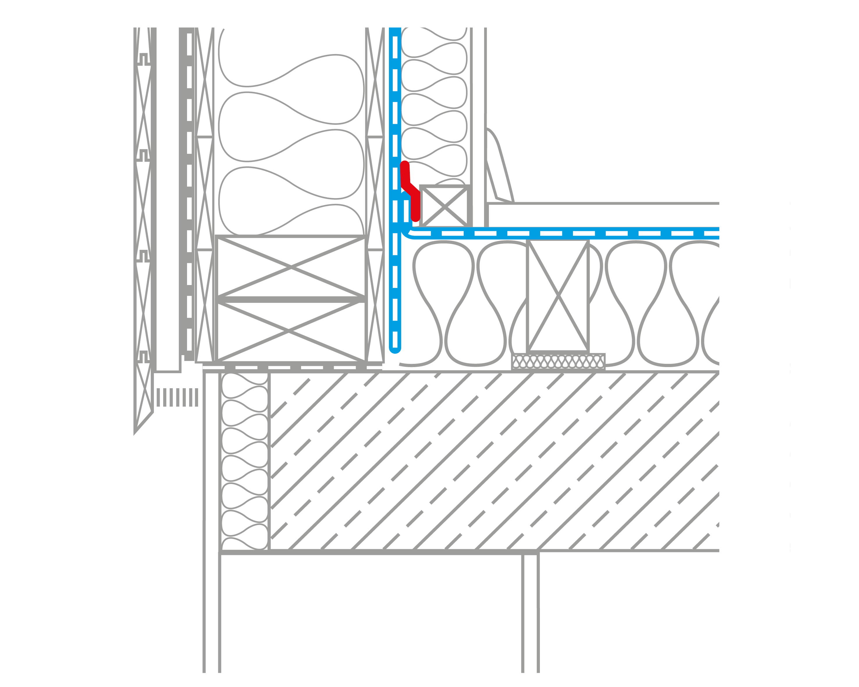 Im Bereich von Innenwänden sollte die Luftdichtungsebene nicht unterbrochen werden. Zur Abdeckung Wandoberkante empfiehlt sich ein robuster (und wetterfester) Streifen der pro clima INTELLO X oder DA bzw den fertig konfektionierten Streifen INTELLO conneX.