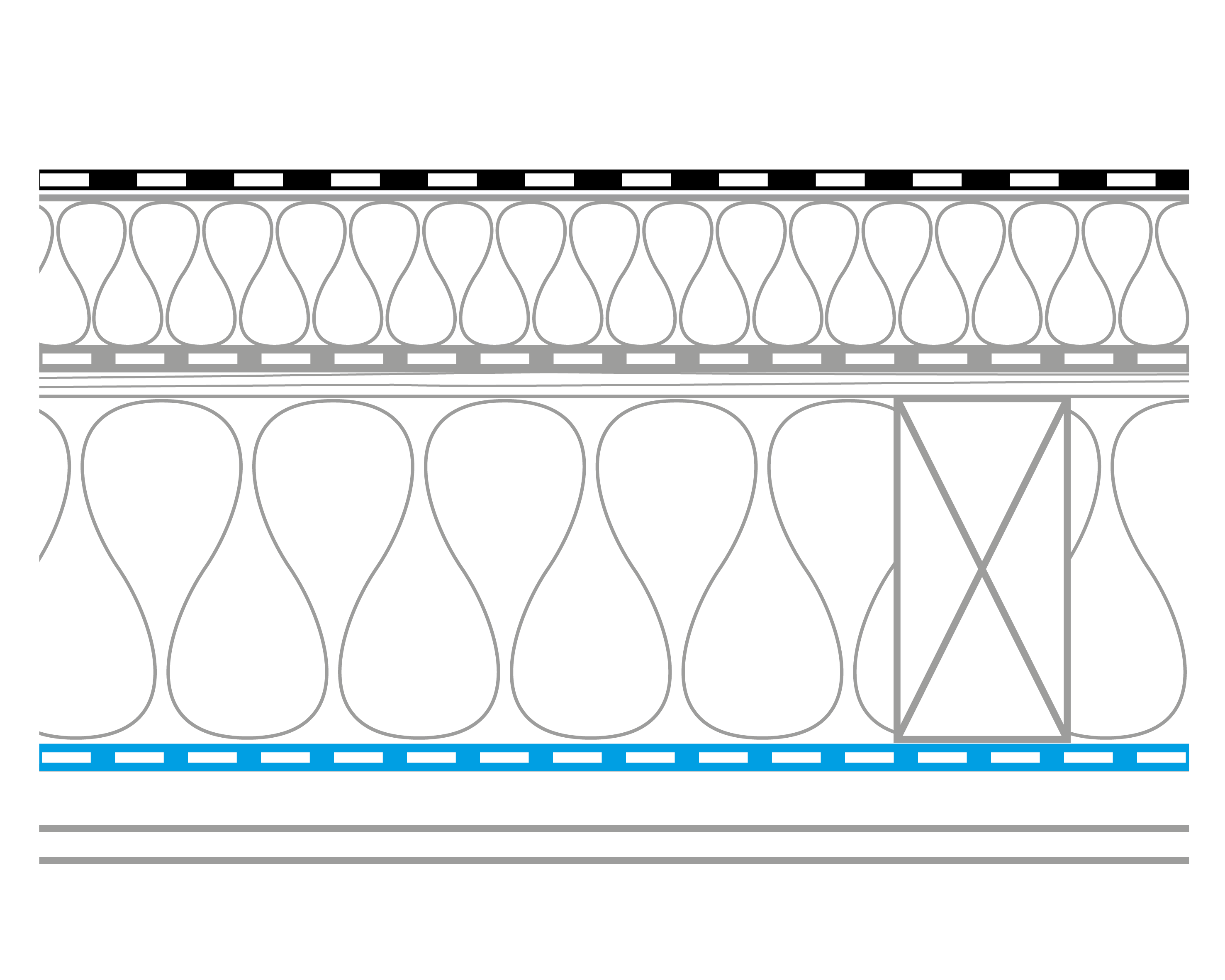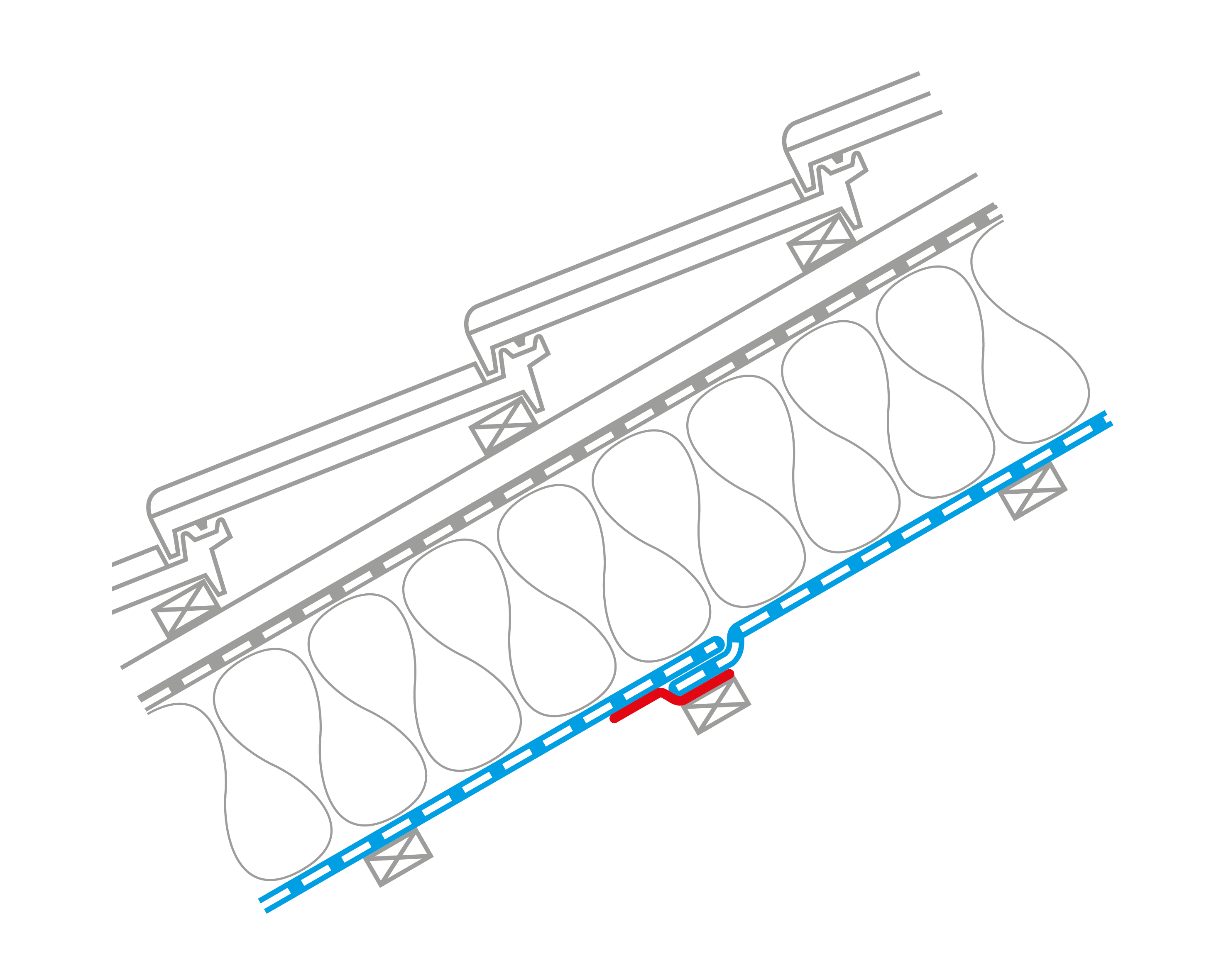 Bei der Verlegung der Bahnen quer zur Tragkonstruktion, z. B. quer zu den Sparren, sollen die Dampfbremsbahnen INTELLO und INTELLO PLUS straff gespannt werden, um einen möglichst hohen Anpressdruck der Klebebänder bei der Montage zu ermöglichen. Da der Dämmstoff auf der Überlappung aufliegen und diese statisch belasten kann, ist auf eine mittige Verlegung des Bandes zu achten. Mindestbreite des Klebebandes 5 cm.