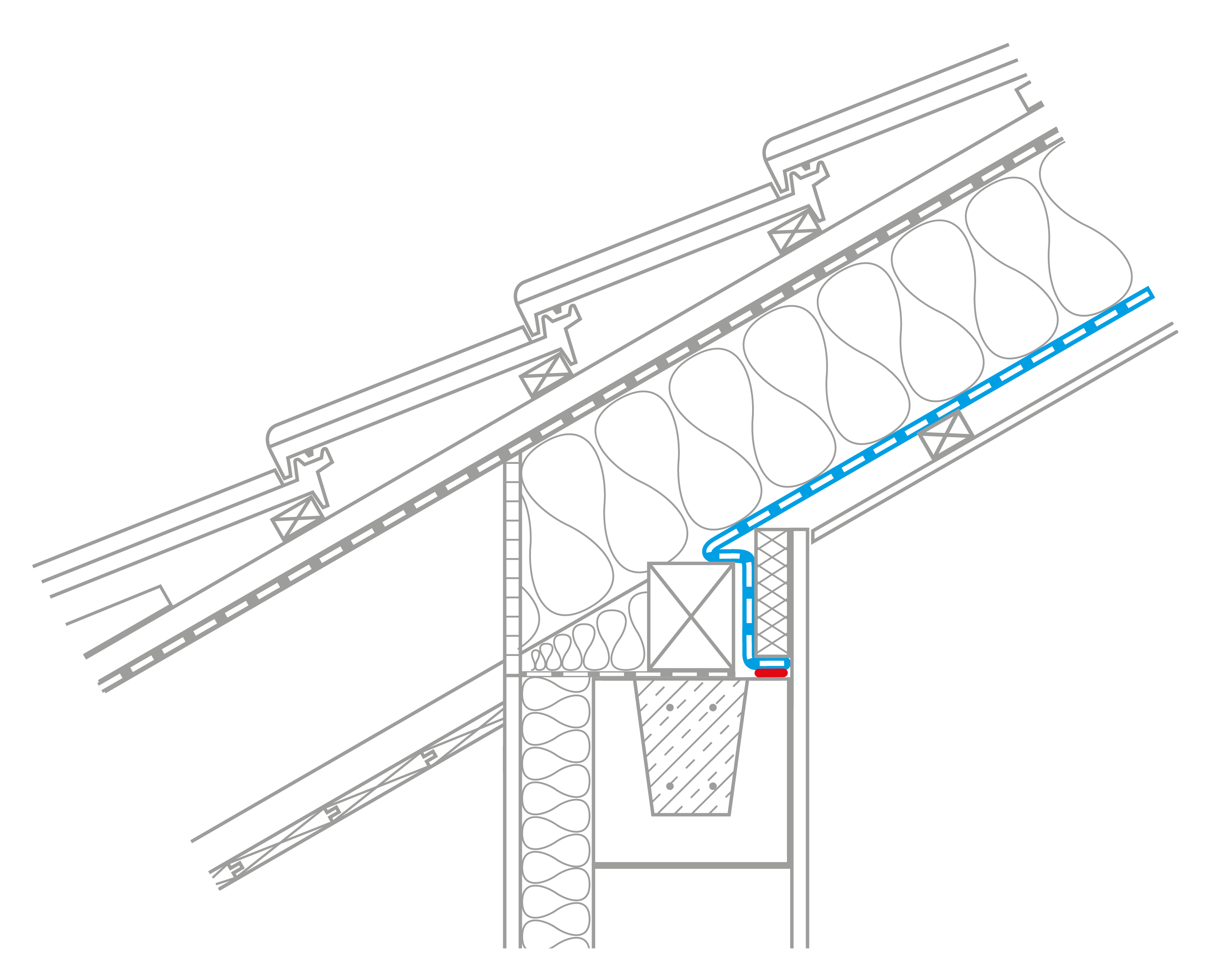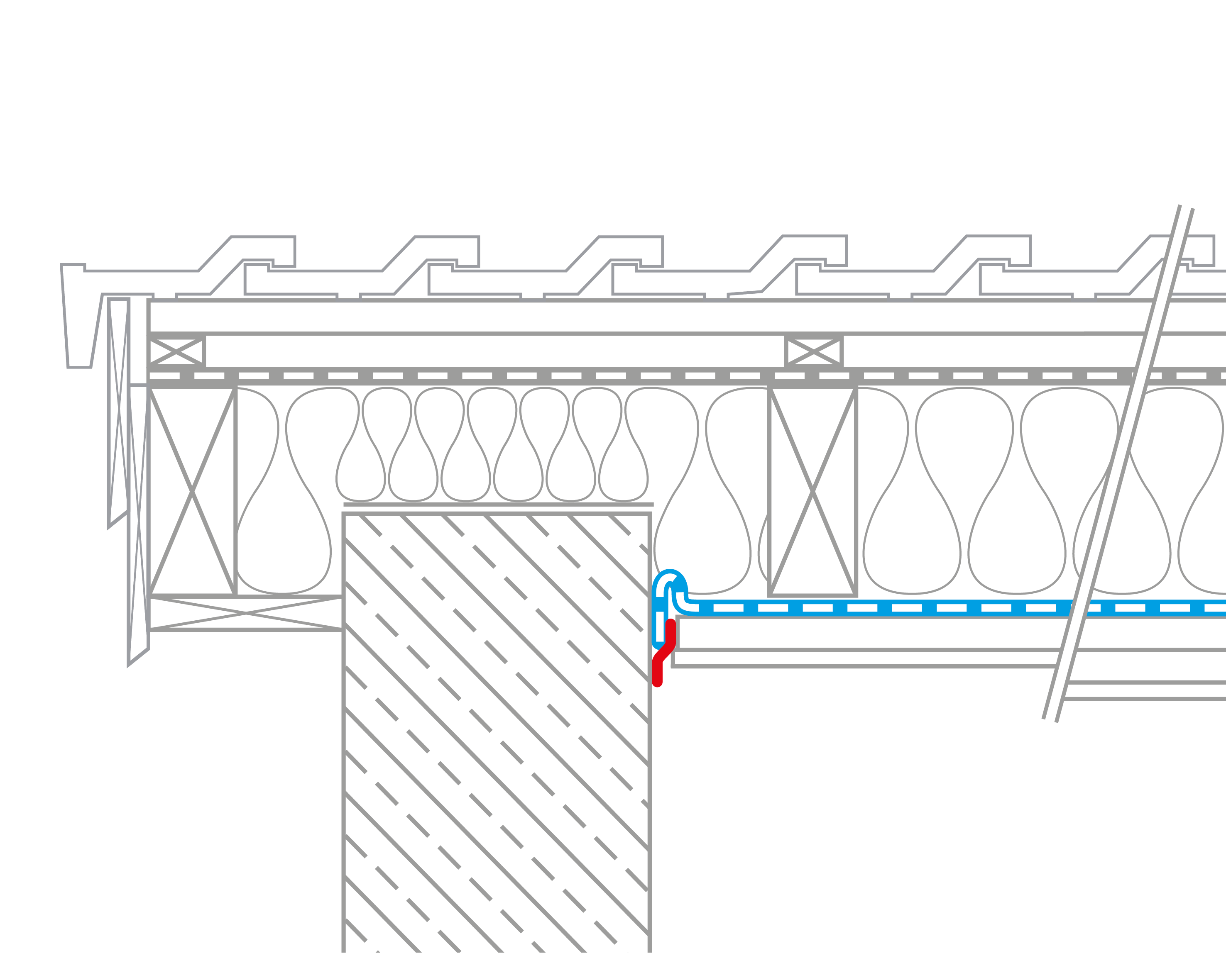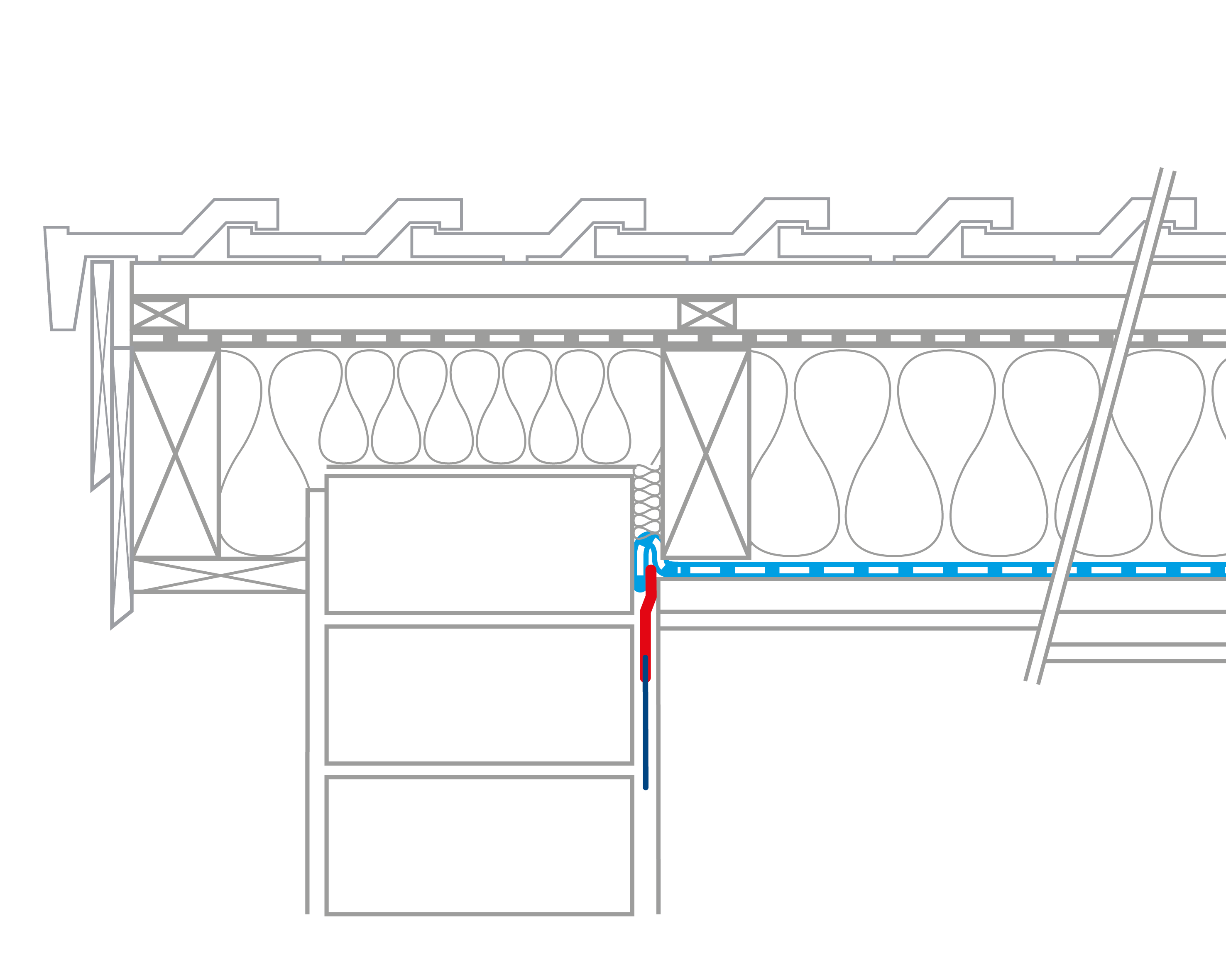 Im Bereich von Innenwänden sollte die Luftdichtungsebene nicht unterbrochen werden. Zur Abdeckung Wandoberkante empfiehlt sich ein robuster (und wetterfester) Streifen der pro clima INTELLO X oder DA bzw den fertig konfektionierten Streifen INTELLO conneX.