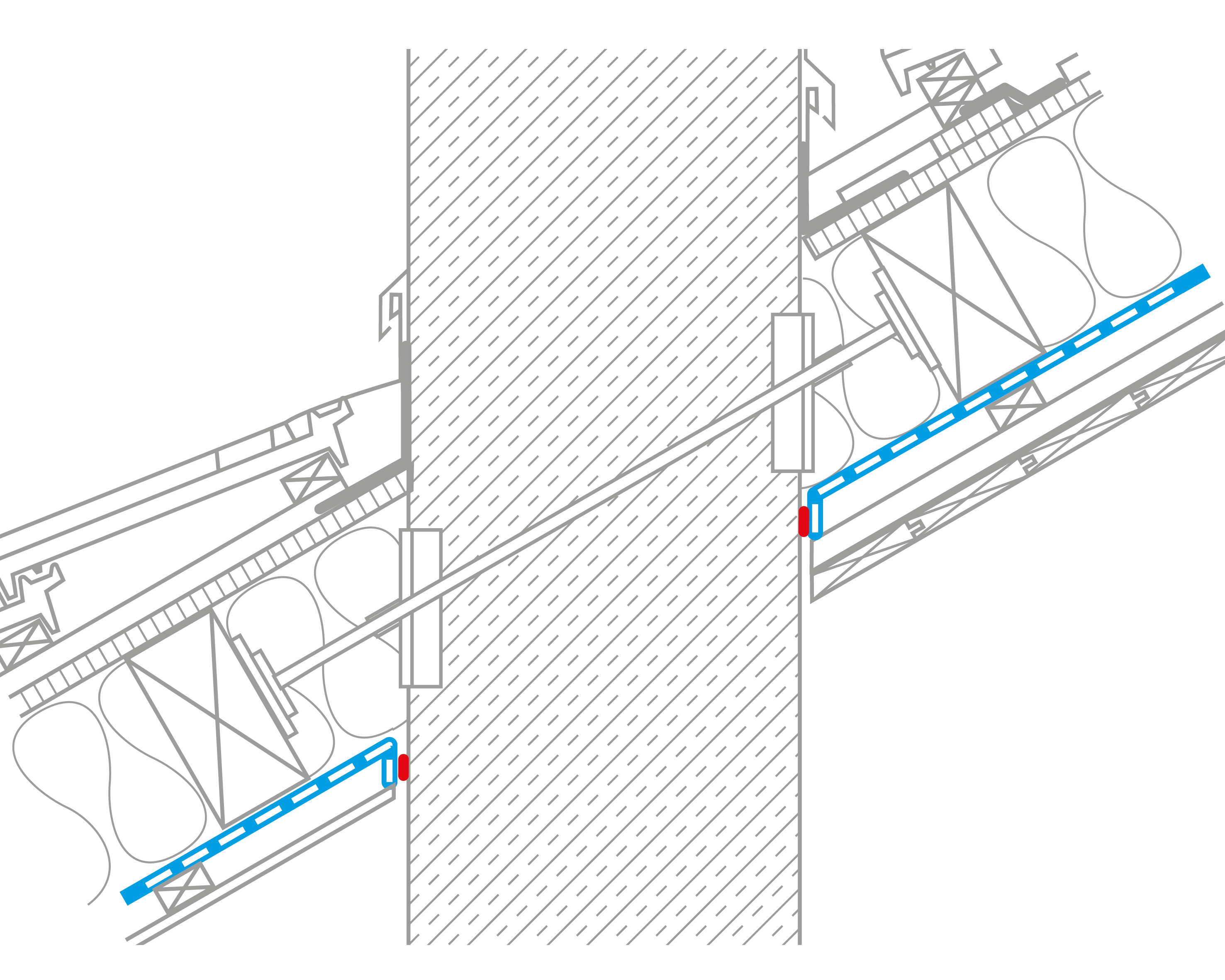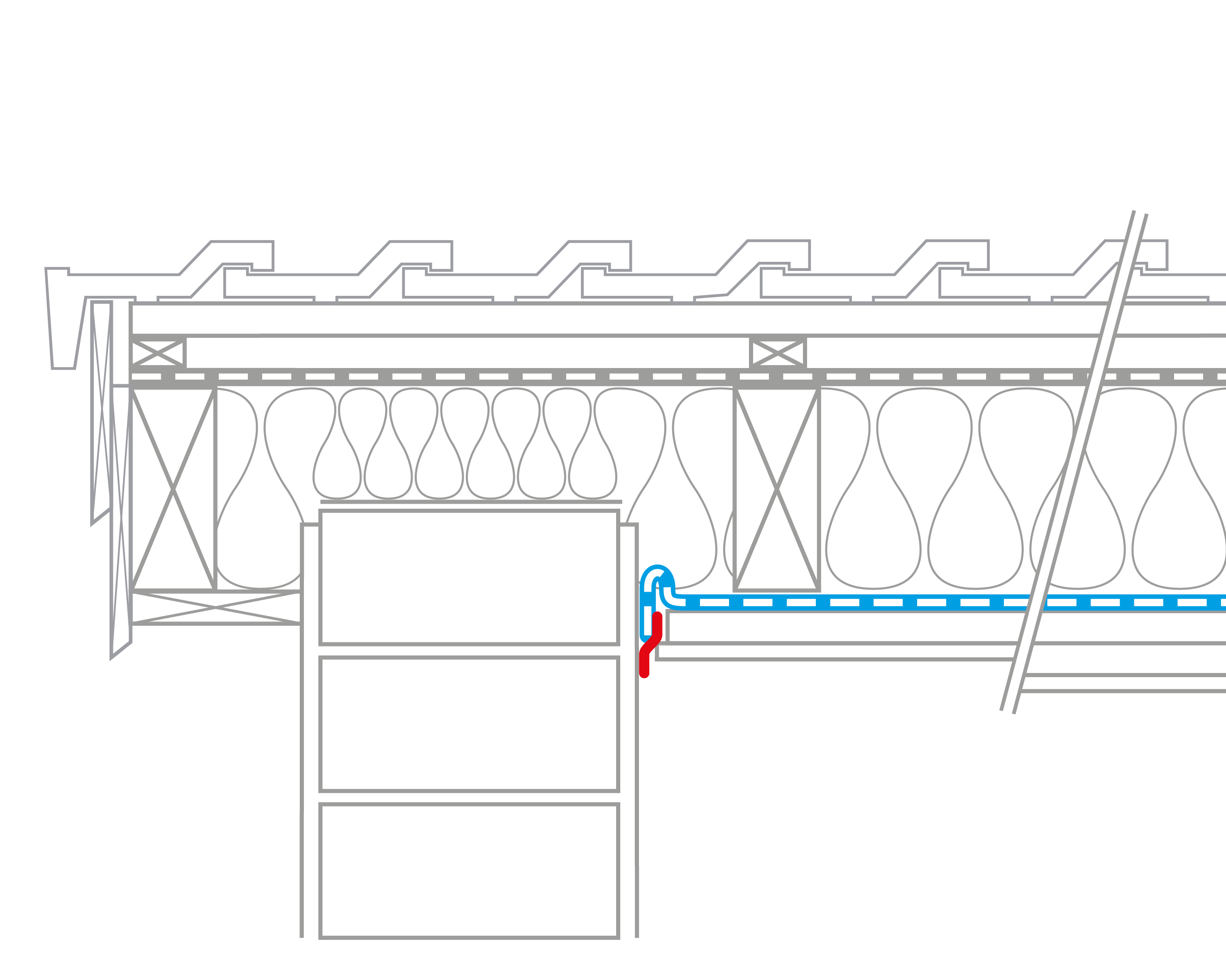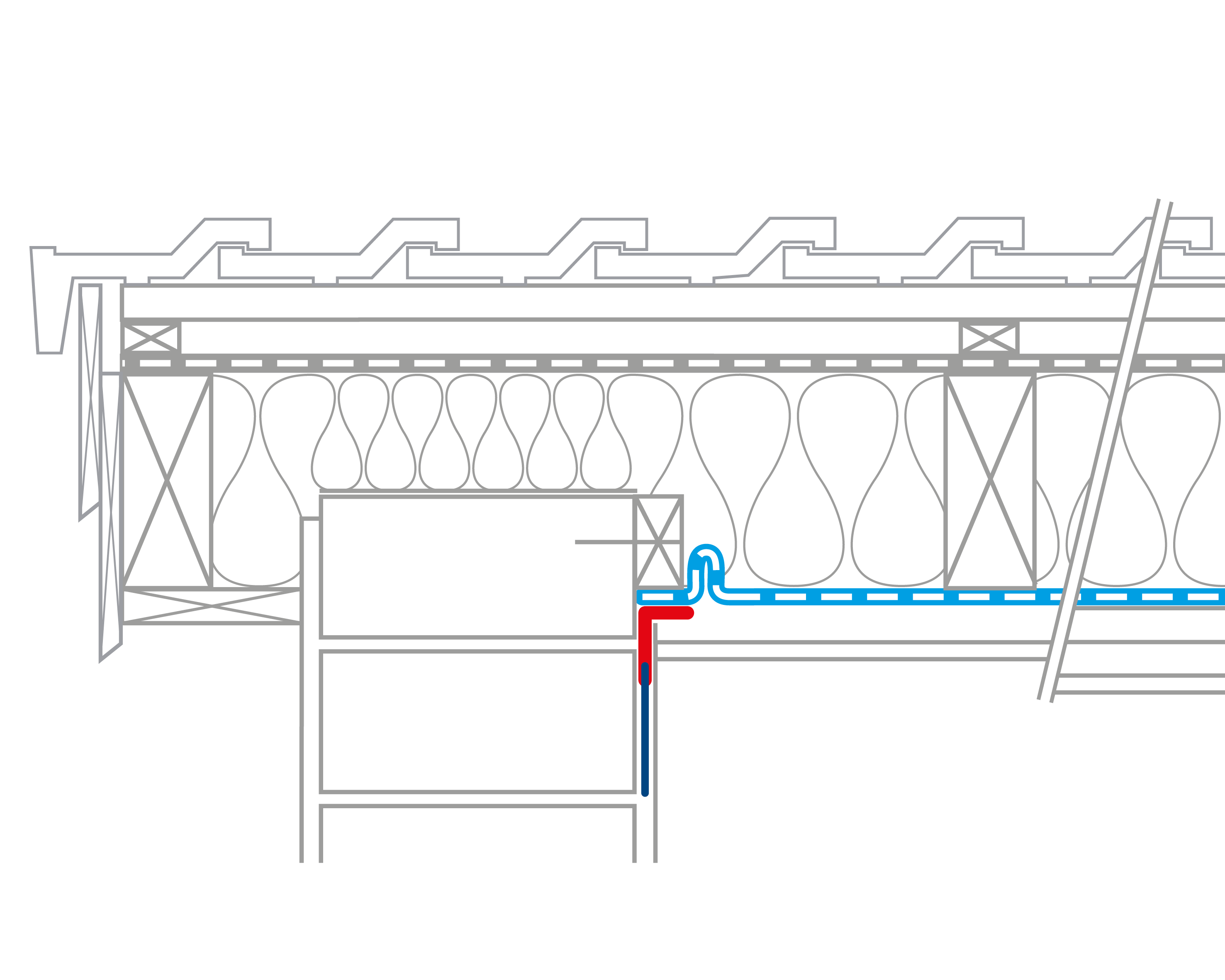 Im Bereich von Innenwänden sollte die Luftdichtungsebene nicht unterbrochen werden. Zur Abdeckung Wandoberkante empfiehlt sich ein robuster (und wetterfester) Streifen der pro clima INTELLO X oder DA bzw den fertig konfektionierten Streifen INTELLO conneX.