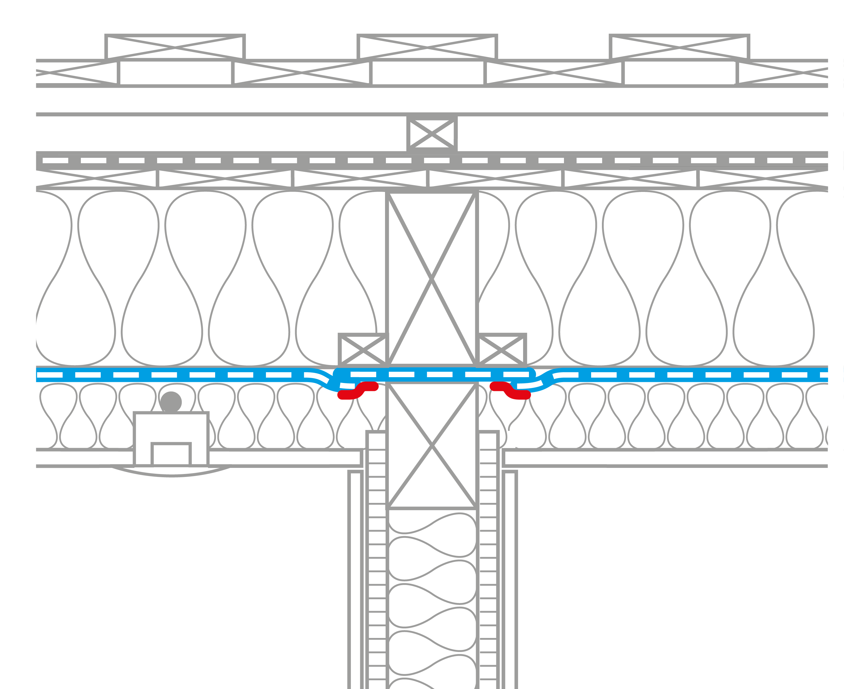 Im Bereich von Innenwänden sollte die Luftdichtungsebene nicht unterbrochen werden. Werden Innenwände vor dem Dämmen und Dichten gestellt, empfiehlt es sich einen robusten (wetterfesten) Dampfbremsbahnenstreifen der pro clima INTELLO X oder DA einzulegen.