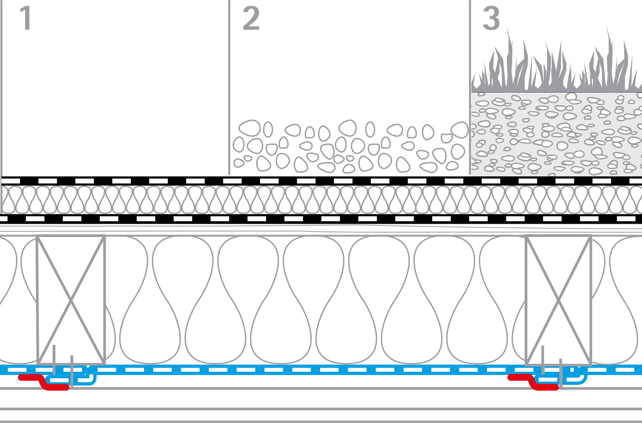(1) Bahnendach (2) Kiesdach (3) Gründach