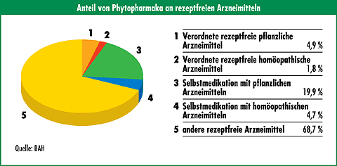 Dazu kommen mit 383 Mio. € Absatz ebenfalls pflanzliche homöopathische Arzneimittel. Der Anteil der Phytopharmaka am Markt der rezeptfreien Arzneimittel beträgt demnach 31 Prozent.