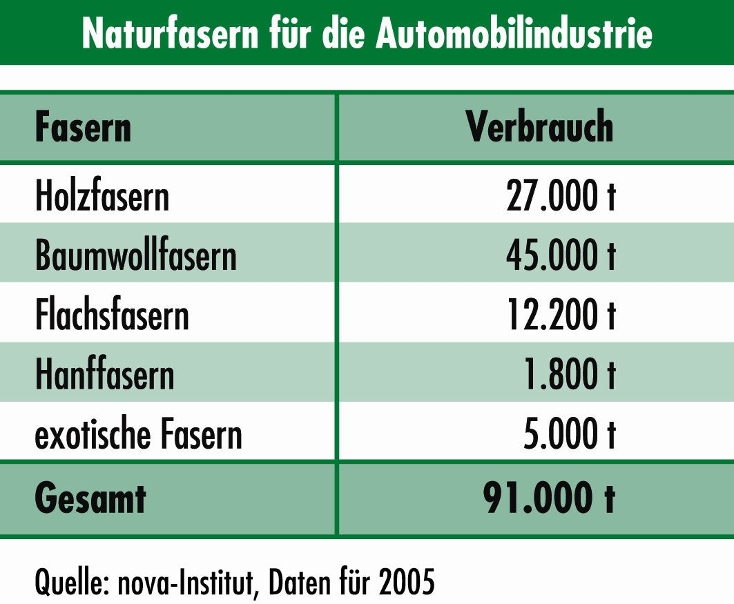 Während Flachs, Hanf und exotische Fasern den Automobilbau erst nach und nach erobern, haben sich Holzfasern und Baumwolle dort längst etabliert. Im Jahr 2005 wurden so in Deutschland insgesamt 91000 t Fasern aus nachwachsenden Rohstoffen verarbeitet.
