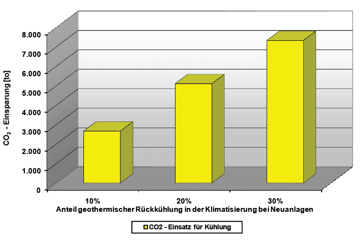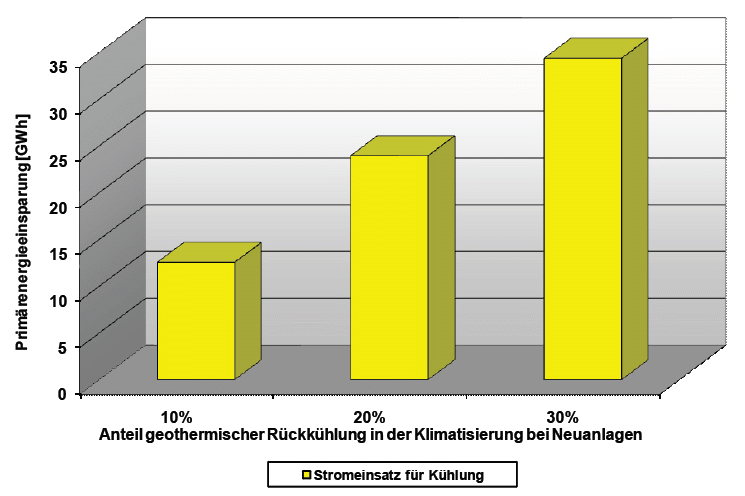 Wenn 30 % der neu installierten Systeme mit geothermischer Rückkühlung ausgestattet werden, beträgt die Energieeinsparung ca. 34 GWhPrimär Strom oder 13 %.