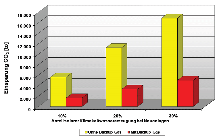 Mögl. CO2-Einsparung solarer Kaltwassererzeugung, Abhängig v. rel. Anteil neu installierter Systeme |