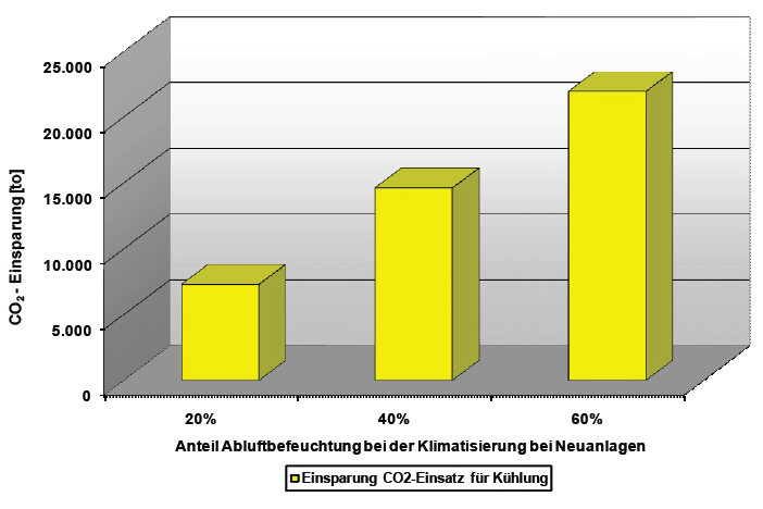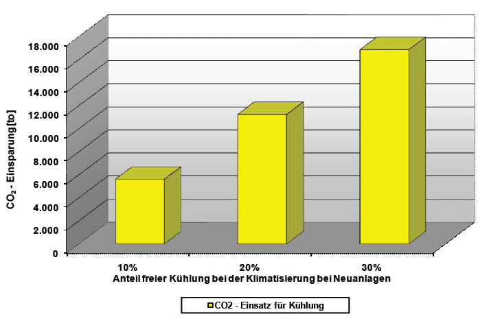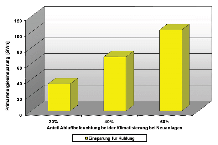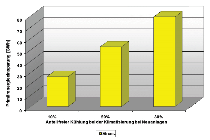 Nach einer Schätzung [2] werden in Deutschland pro Jahr Kaltwassererzeuger mit einer Gesamtkälteleistung von etwa 1.100 MW verkauft. Dies beinhaltet die Maschinen für Neubau und Sanierung. Unterstellt man, dass ca. 40 % davon für die Komfortklimatisierung eingesetzt und diese mit 700 Vollbenutzungsstunden betrieben werden, so ergibt sich für die jährlich neu verkauften Kaltwassererzeuger ein Gesamtstrombedarf von ca. 263,4 GWh (EER = 3,5).