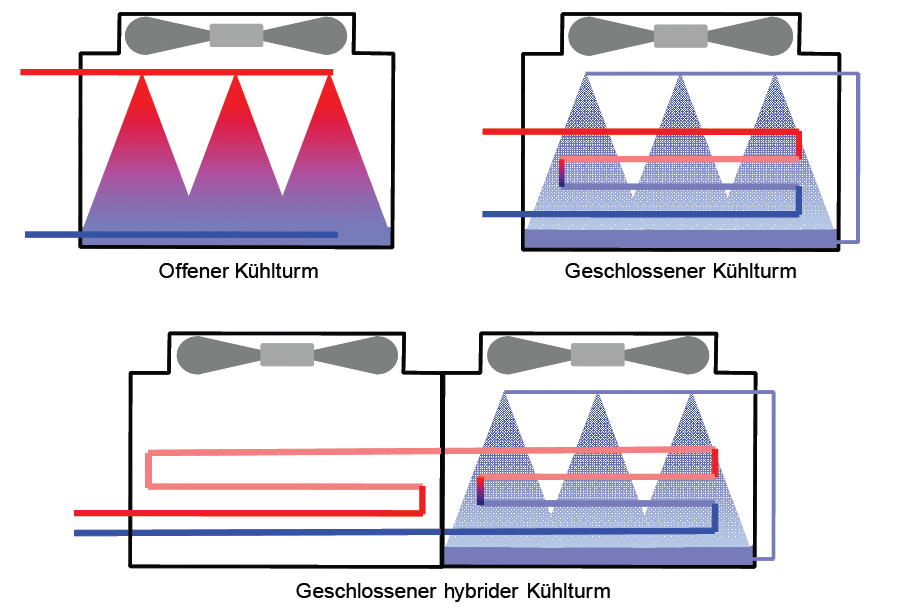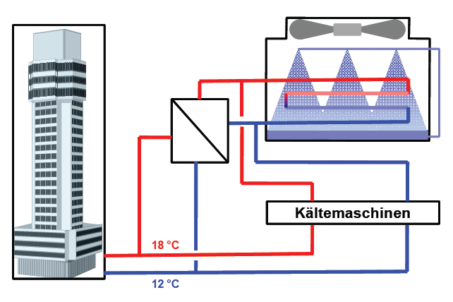 Eine seit Jahrtausenden verwendete Methode zur Kühlung ist die Verdunstung von Wasser. Neben der direkten Nutzung der Verdunstungskühlung im Klimazentralgerät (siehe Abschnitt 2.2 - Thermische Klimaprozesse – Sorptionsklimasysteme) kann die Verdunstungskühlung auch indirekt über Kühltürme oder WRG-Fortluftwärmeübertrager mit Kreislaufverbundsystem genutzt werden. Hier ist jedoch zu beachten, dass bei diesen Systemen insbesondere im Sommer in Abhängigkeit der Feuchtkugeltemperatur für die Nutzung zur Kühlung nur vergleichsweise hohe Kühlwassertemperaturen erreicht werden. Wichtig ist in diesem Zusammenhang die Trennung der Funktionen Luft- oder Raumkühlung und Luftentfeuchtung. Für die Anwendung in der Klimatechnik ist die freie Kühlung nicht nutzbar für die Entfeuchtung. Für den Entfeuchtungsbetrieb passt ideal ein Sorptionsklimasystem (siehe Abschnitt 2.2 - Thermische Klimaprozesse – Sorptionsklimasysteme). Wie bei der Nutzung der Erdkälte ist bei den Raumkühlsystemen darauf zu achten, dass diese Systeme mit hohen Wassertemperaturen arbeiten können (siehe Abschnitt 3.1.1 - Flächenkühlung). Für die Nutzung mit freier Kühlung ist eine Systemtemperatur oberhalb 18 °C anzustreben.