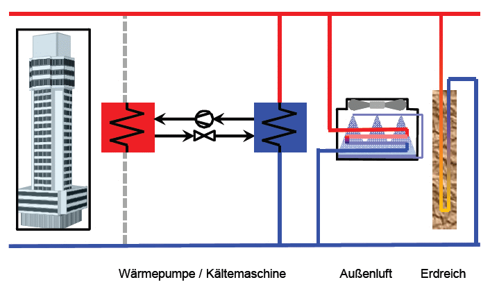 Reicht das Temperaturniveau des aus dem Erdreich strömenden Trägermediums nicht aus, um die erforderliche Kühlaufgabe zu übernehmen, dann kann das Erdreich als Wärmesenke für eine Kältemaschine verwendet werden. Dies ist zum Beispiel dann notwendig, wenn die Zuluft des Gebäudes für die Klimatisierungsaufgabe entfeuchtet werden muss. Die notwendige Kaltwassertemperatur für die Entfeuchtung beträgt dann ca. 6 bis 8 °C und dies steht im Erdreich nicht zur Verfügung.