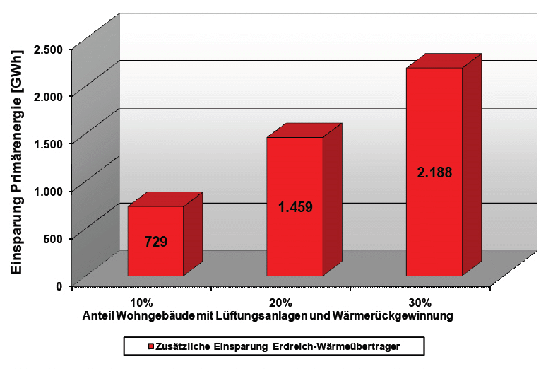 Das Diagramm zeigt die mögliche Primärenergieeinsparung, wenn Lüftungsanlagen im Wohnungsbau mit Erdreich-Wärmeübertrager ausgerüstet werden. Nimmt man beispielsweise an, dass zu einem zukünftigen Zeitpunkt 10 % des gesamten Gebäudebestandes mit Lüftungsanlagen ausgerüstet sind, dann ergeben sich beim Einbau von Erdreich- Wärmeübertragern zusätzliche Energieeinsparungen von 729 GWh pro Jahr [5], [6].