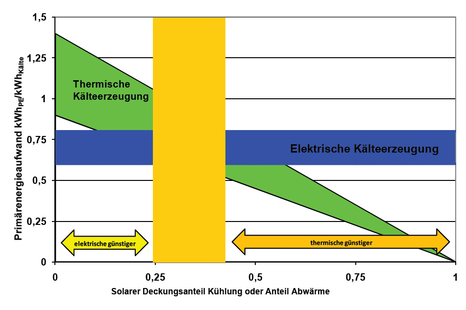 Vergleich Primärenergieaufwand für thermische / elektrische Kälteerzeugung in Abhängigkeit des solaren Deckungsanteiles |