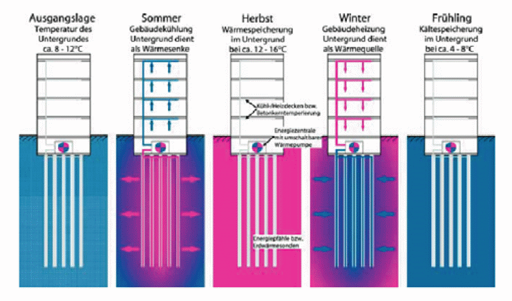 Abhängig vom notwendigen Temperaturniveau und der Leistungsfähigkeit des Systems kann die geothermische Energie auf vielfältige Weise im Gebäude genutzt werden. Im Sommer dient der Untergrund als Wärmesenke. Die notwendige Kühlenergie wird dem Gebäude entzogen und dem Untergrund zugeführt. Dies kann direkt (nächster Abschnitt 3.1 - Direkte Nutzung der Erdkälte) oder über die Nutzung einer Kältemaschine oder Wärmepumpe (Abschnitt 3.2 - Nutzung der Erdkälte über Kältemaschinen) geschehen.