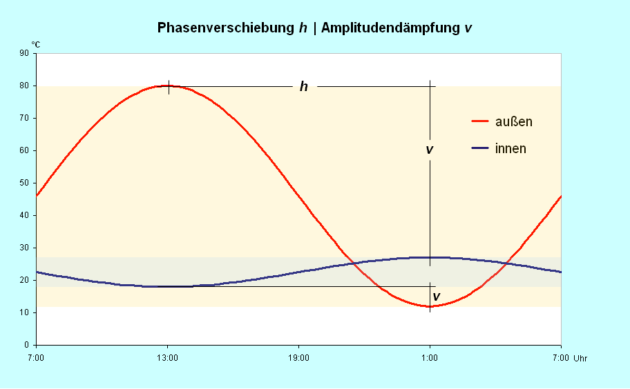 - eine Zeitverzögerung zwischen Auftreten hoher Außentemperaturen bis zur Durchdringung nach innen zu erreichen, wenn außen bereits wieder kühlere Temperaturen herrschen. Siehe Phasenverschiebung.