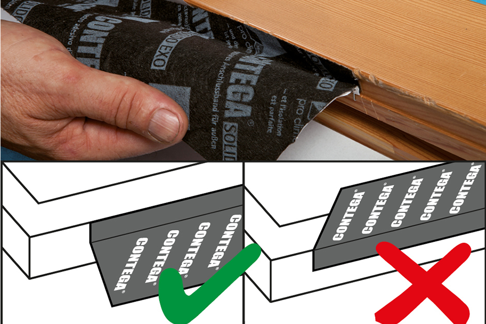 Luftdichte Verklebungen können nur bei faltenfreiem und ununterbrochenem Einbau des Anschlussbandes erreicht werden.