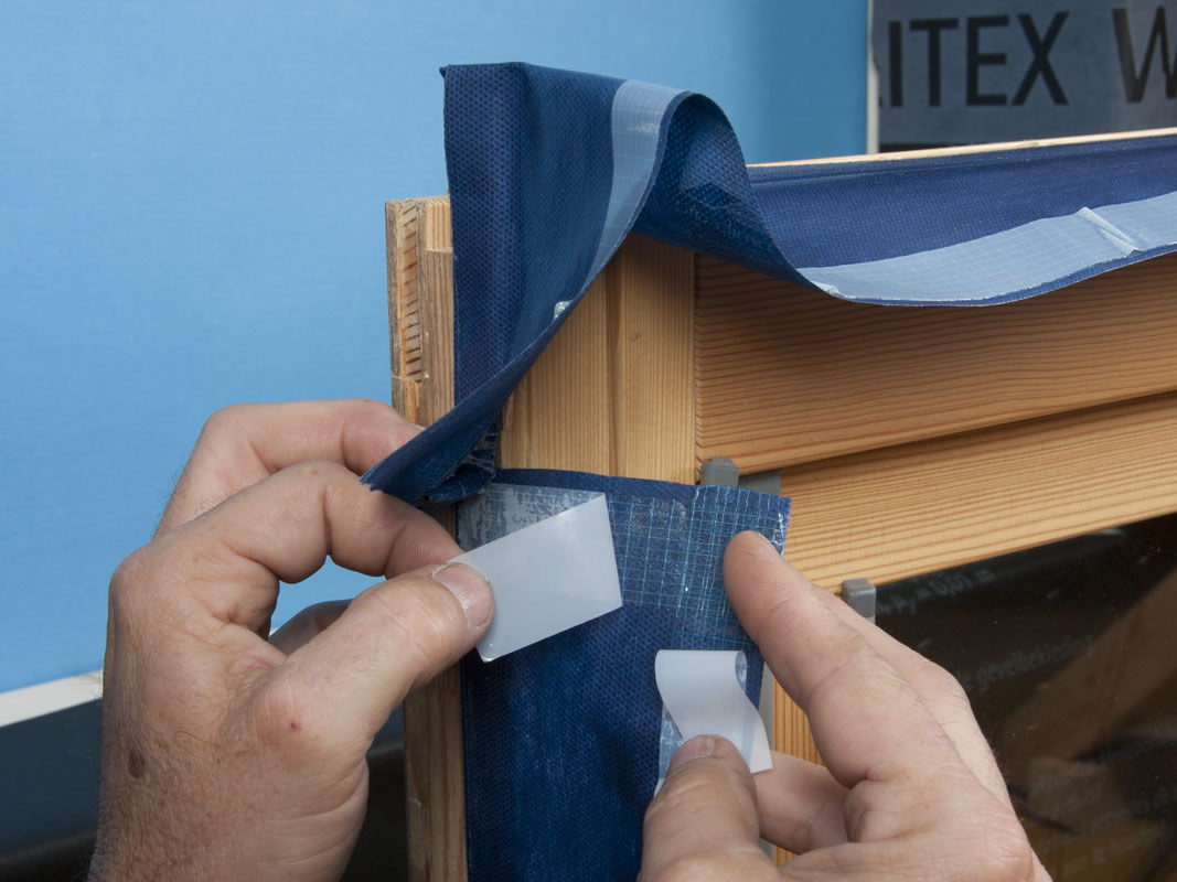 - Die Eckfaltungen und die Stöße des Bandes sind mit dem pro clima DUPLEX luftdicht zu verkleben, oder ohne Unterbrechung zu überfalten.