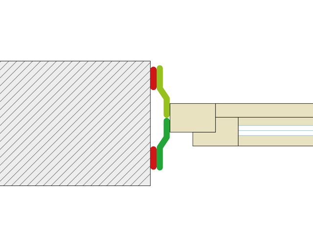 - Außen: eingeputzt bzw. außen durch die äußere Verkleidung abgedeckt.