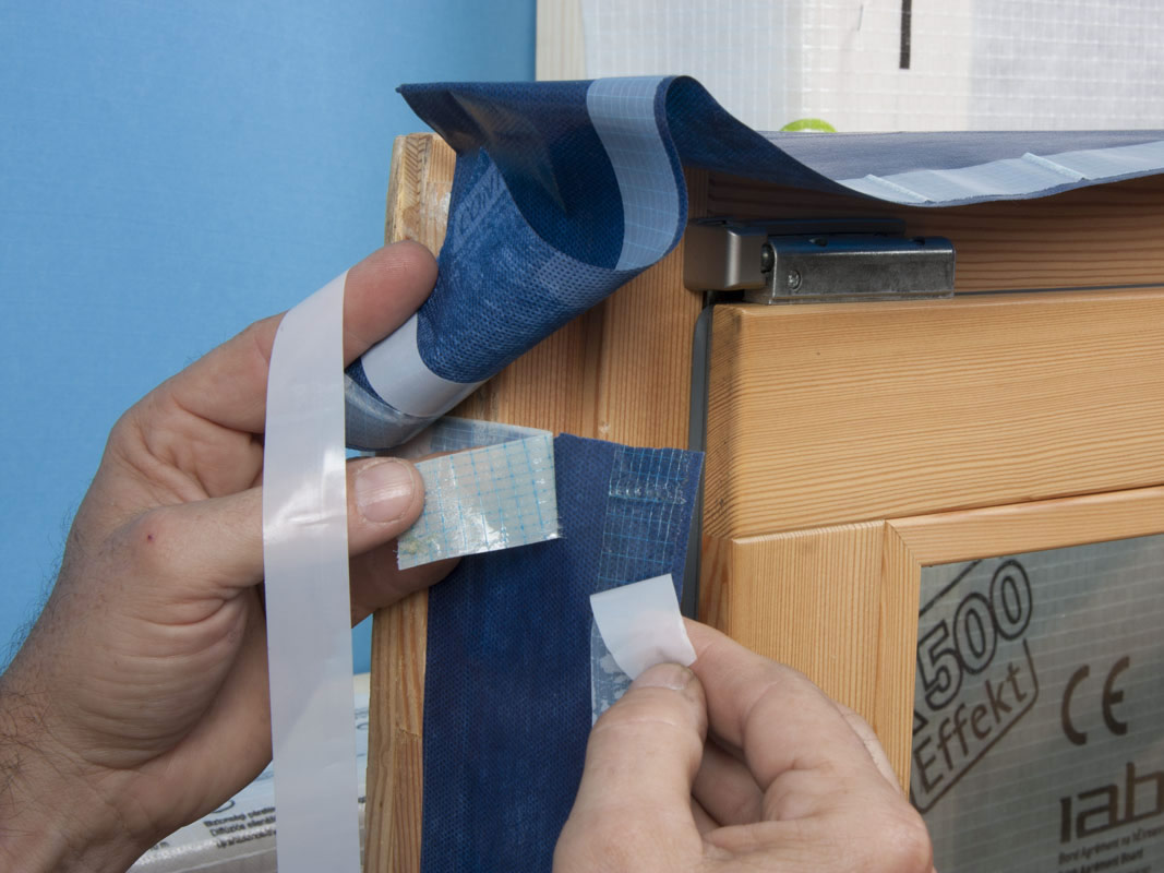 Putz- + Fensteranschl. innen/außen ... vollflächig klebend ... zusätzl. Klebezone ... und vorgefaltet |