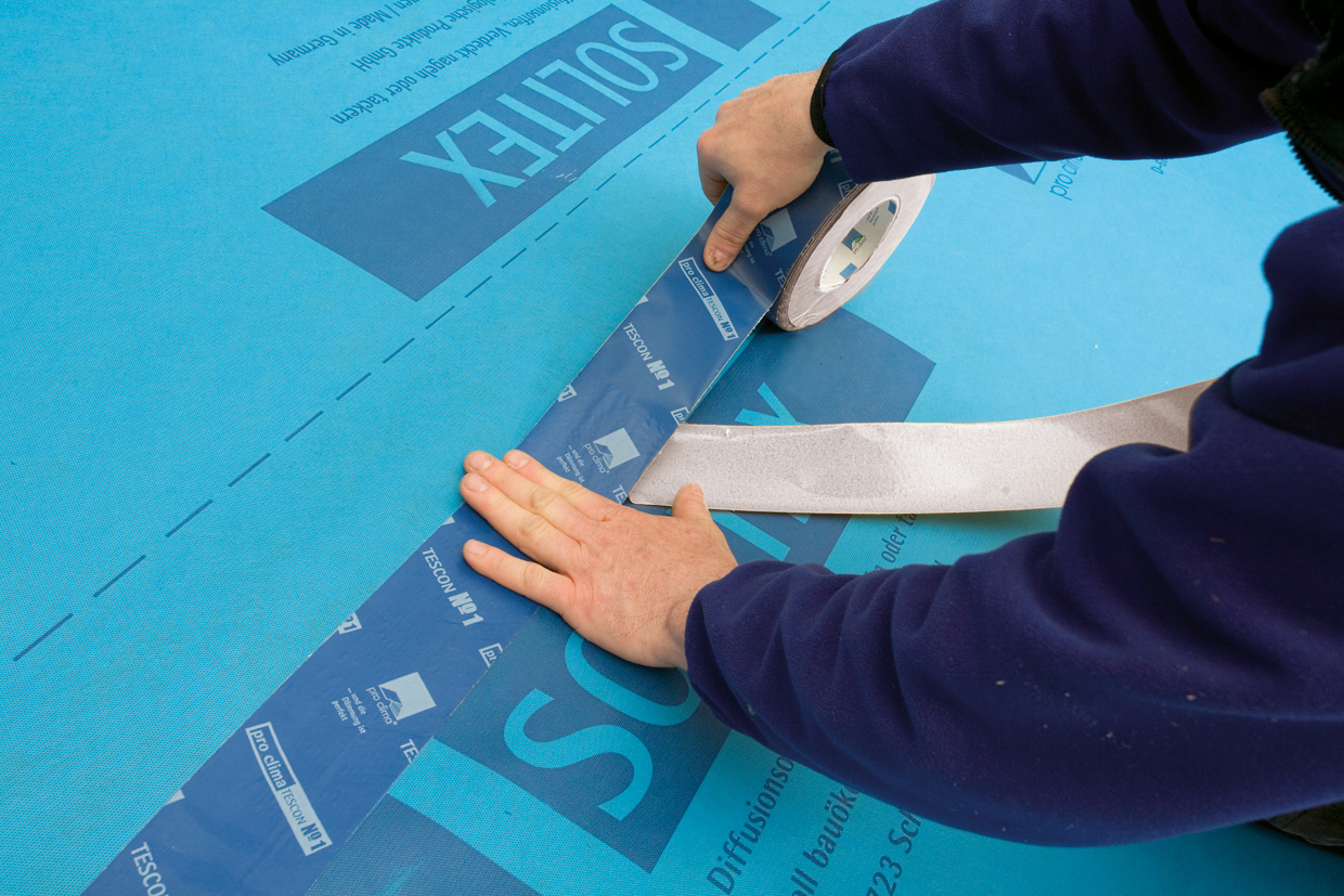 Wird der Dämmstoff von außen eingeblasen, können die Einblaslöcher anschließend mit dem 15 cm breiten TESCON VANA verklebt werden.