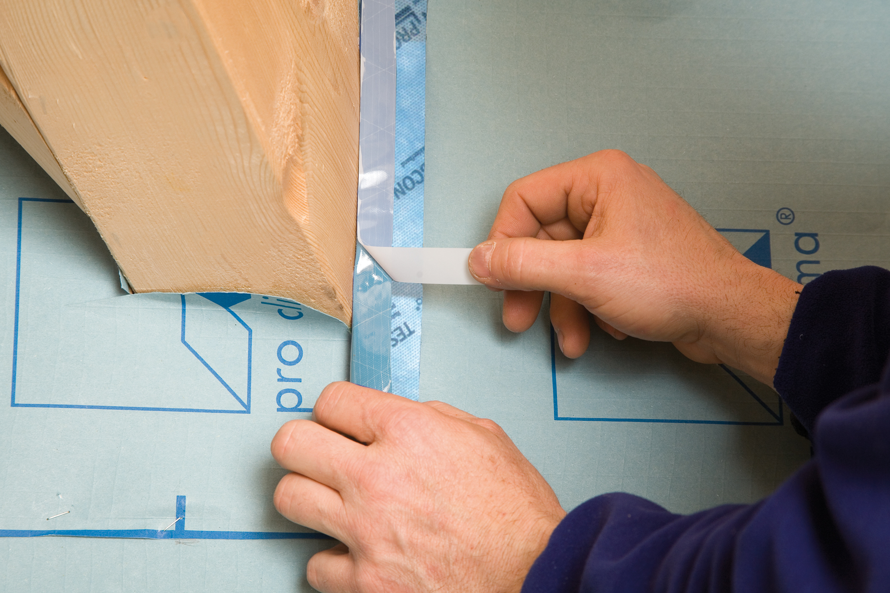 Eckanschlüsse z. B. an Fenster im Holzrahmenbau oder an Eckverbindungen lassen sich sauber und gerade mit dem Allround-Eckklebeband TESCON PROFECT herstellen.